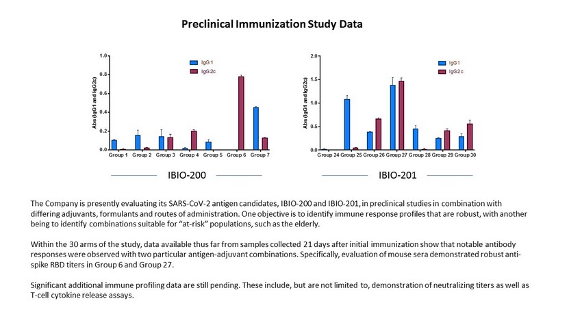 Group 1 Group 2 Group 3 Group 4 Group 5 Group 6 Group 7 0.0 0.2 0.4 0.6 0.8 1.0 A b s ( I g G 1 a n d I g G 2 c ) IgG1 IgG2c Group 24Group 25Group 26Group 27Group 28Group 29Group 30 0.0 0.5 1.0 1.5 2.0 A b s ( I g G 1 a n d I g G 2 c ) IgG1 IgG2c IBIO - 200 IBIO - 201 The Company is presently evaluating its SARS - CoV - 2 antigen candidates, IBIO - 200 and IBIO - 201, in preclinical studies in combinat ion with differing adjuvants, formulants and routes of administration. One objective is to identify immune response profiles that are rob ust, with another being to identify combinations suitable for “at - risk” populations, such as the elderly. Within the 30 arms of the study, data available thus far from samples collected 21 days after initial immunization show that not able antibody responses were observed with two particular antigen - adjuvant combinations. Specifically, evaluation of mouse sera demonstrated robust anti - spike RBD titers in Group 6 and Group 27. Significant additional immune profiling data are still pending. These include, but are not limited to, demonstration of neutr ali zing titers as well as T - cell cytokine release assays. Preclinical Immunization Study Data
