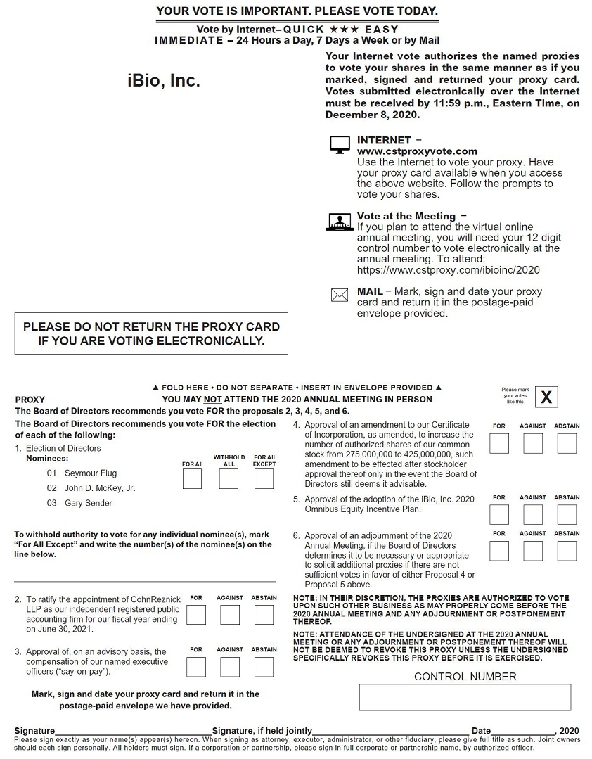 PLEASE DO NOT RETURN THE PROXY CARD IF YOU ARE VOTING ELECTRONICALLY. Signature Signature, if held jointly Date , 2020 Please sign exactly as your name(s) appear(s) hereon. When signing as attorney, executor, administrator, or other fiduciary, please give full title as such. Joint owners should each sign personally. All holders must sign. If a corporation or partnership, please sign in full corporate or partnership name, by authorized officer. Please mark your votes like this X PROXY The Board of Directors recommends you vote FOR the proposals 2, 3, 4, 5, and 6. 16931_iBio_Proxy Card REV2- Front CONTROL NUMBER FOLD HERE • DO NOT SEPARATE • INSERT IN ENVELOPE PROVIDED To withhold authority to vote for any individual nominee(s), mark “For All Except” and write the number(s) of the nominee(s) on the line below. 1. Election of Directors Nominees: 01 Seymour Flug 02 John D. McKey, Jr. 03 Gary Sender 2. To ratify the appointment of CohnReznick LLP as our independent registered public accounting firm for our fiscal year ending on June 30, 2021. 3. Approval of, on an advisory basis, the compensation of our named executive officers (“say-on-pay”). 4. Approval of an amendment to our Certificate of Incorporation, as amended, to increase the number of authorized shares of our common stock from 275,000,000 to 425,000,000, such amendment to be effected after stockholder approval thereof only in the event the Board of Directors still deems it advisable. 5. Approval of the adoption of the iBio, Inc. 2020 Omnibus Equity Incentive Plan. 6. Approval of an adjournment of the 2020 Annual Meeting, if the Board of Directors determines it to be necessary or appropriate to solicit additional proxies if there are not sufficient votes in favor of either Proposal 4 or Proposal 5 above. Your Internet vote authorizes the named proxies to vote your shares in the same manner as if you marked, signed and returned your proxy card. Votes submitted electronically over the Internet must be received by 11:59 p.m., Eastern Time, on December 8, 2020. YOUR VOTE IS IMPORTANT. PLEASE VOTE TODAY. IMMEDIATE - 24 Hours a Day, 7 Days a Week or by Mail Vote by Internet- QUICK EASY INTERNET – www.cstproxyvote.com Use the Internet to vote your proxy. Have your proxy card available when you access the above website. Follow the prompts to vote your shares. Vote at the Meeting – If you plan to attend the virtual online annual meeting, you will need your 12 digit control number to vote electronically at the annual meeting. To attend: https://www.cstproxy.com/ibioinc/2020 MAIL – Mark, sign and date your proxy card and return it in the postage-paid envelope provided. FOR All FOR All EXCEPT WITHHOLD ALL The Board of Directors recommends you vote FOR the election of each of the following: FOR AGAINST ABSTAIN FOR AGAINST ABSTAIN FOR AGAINST ABSTAIN FOR AGAINST ABSTAIN FOR AGAINST ABSTAIN NOTE: IN THEIR DISCRETION, THE PROXIES ARE AUTHORIZED TO VOTE UPON SUCH OTHER BUSINESS AS MAY PROPERLY COME BEFORE THE 2020 ANNUAL MEETING AND ANY ADJOURNMENT OR POSTPONEMENT THEREOF. NOTE: ATTENDANCE OF THE UNDERSIGNED AT THE 2020 ANNUAL MEETING OR ANY ADJOURNMENT OR POSTPONEMENT THEREOF WILL NOT BE DEEMED TO REVOKE THIS PROXY UNLESS THE UNDERSIGNED SPECIFICALLY REVOKES THIS PROXY BEFORE IT IS EXERCISED. Mark, sign and date your proxy card and return it in the postage-paid envelope we have provided. YOU MAY NOT ATTEND THE 2020 ANNUAL MEETING IN PERSON iBio, Inc.