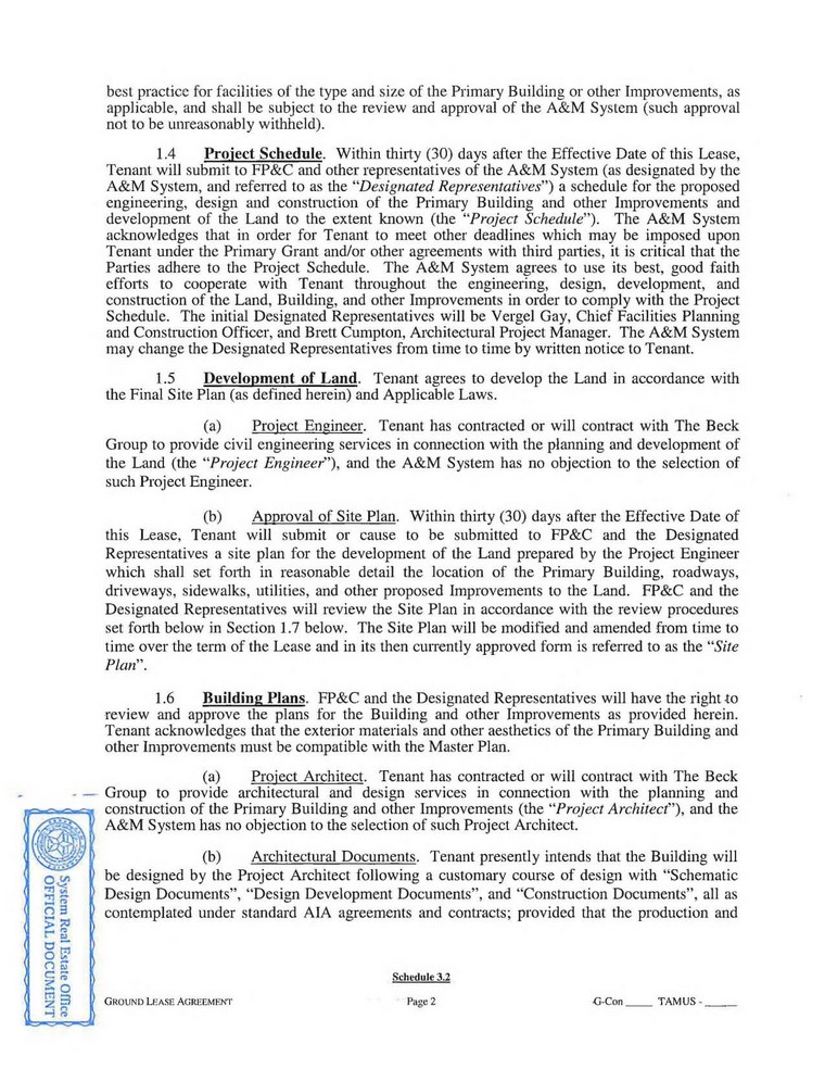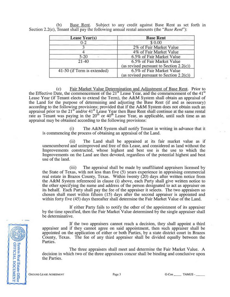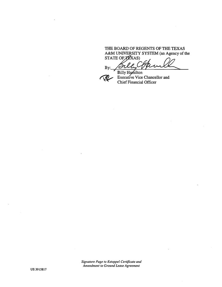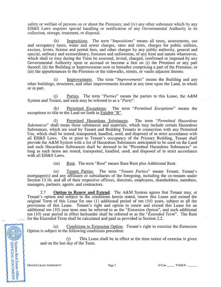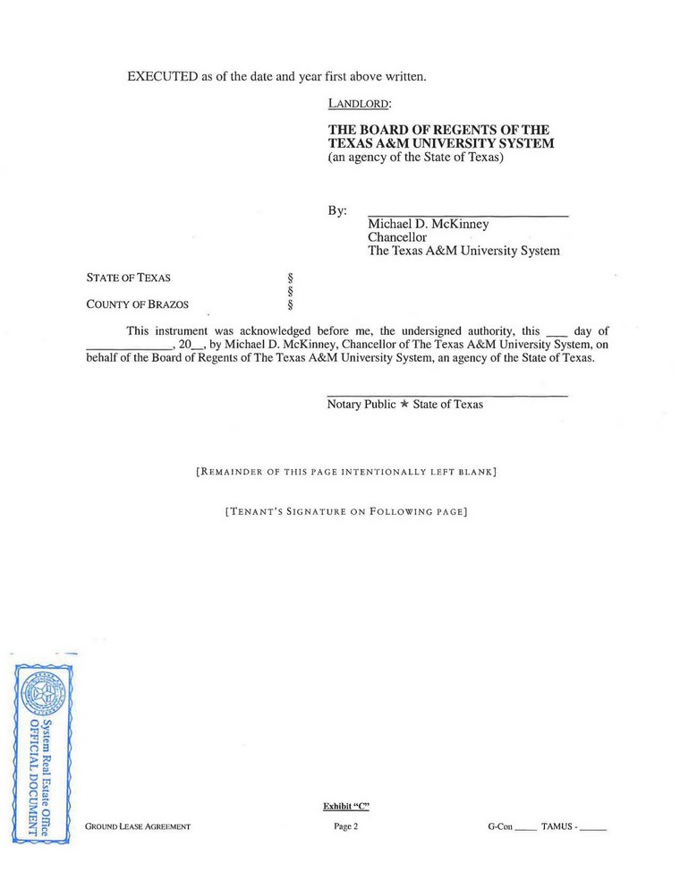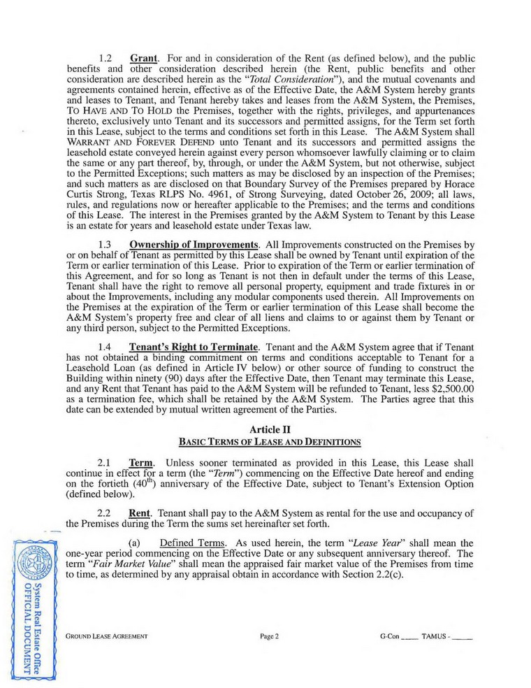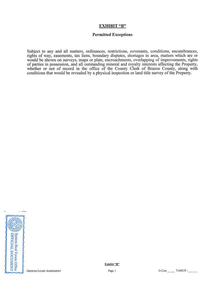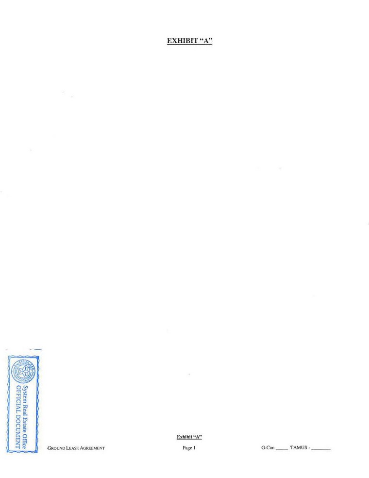 A. College Station is the tenant under the Ground Lease dated March 8, 2010, between The Board of Regents of the Texas A&M University System, an agency of the State of Texas (“A&M”), as landlord, and College Station’s predecessor in interest, as tenant, as amended by the Estoppel Certificate and Amendment to Ground Lease Agreement between A&M and College Station dated December 22, 2015 (together, the “Ground Lease”), related to that certain parcel of real estate located in Brazos County, Texas, as more particularly described on Exhibit A attached hereto (the “Land”).