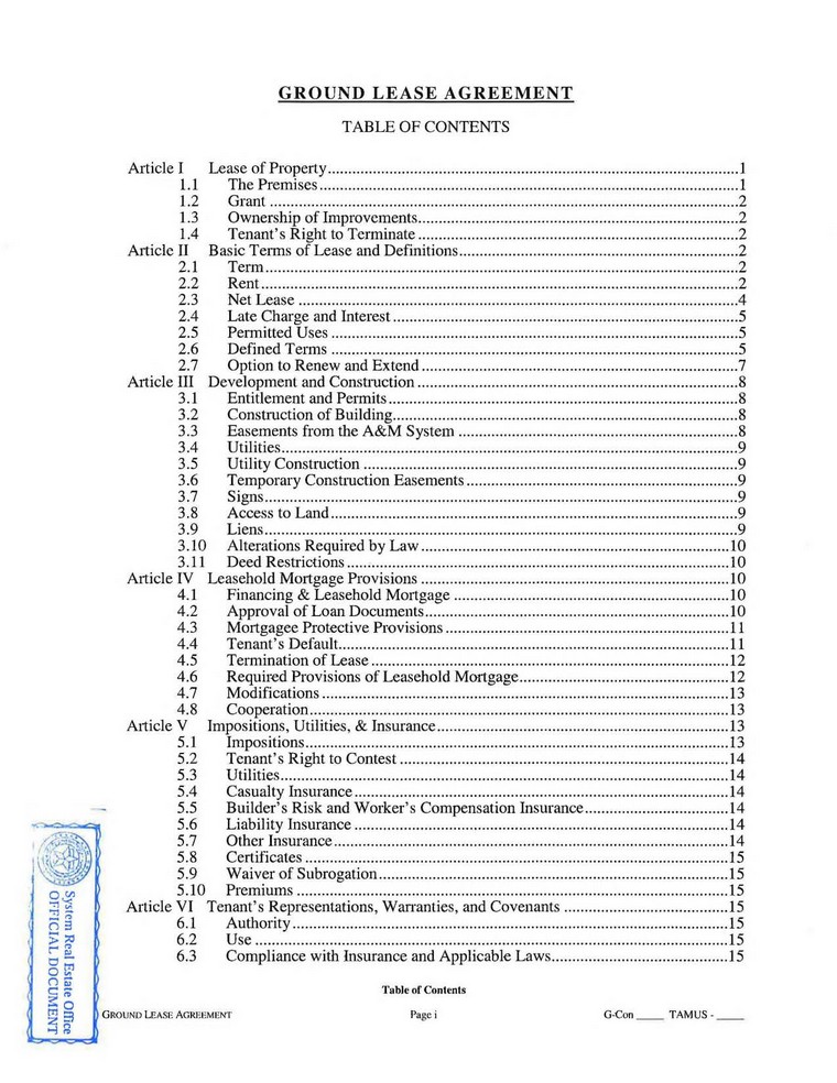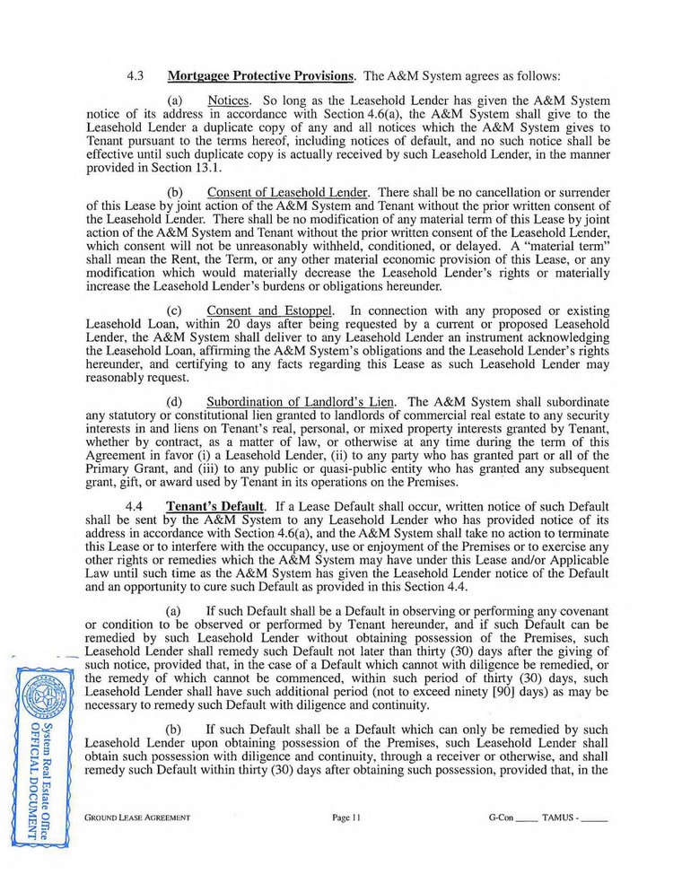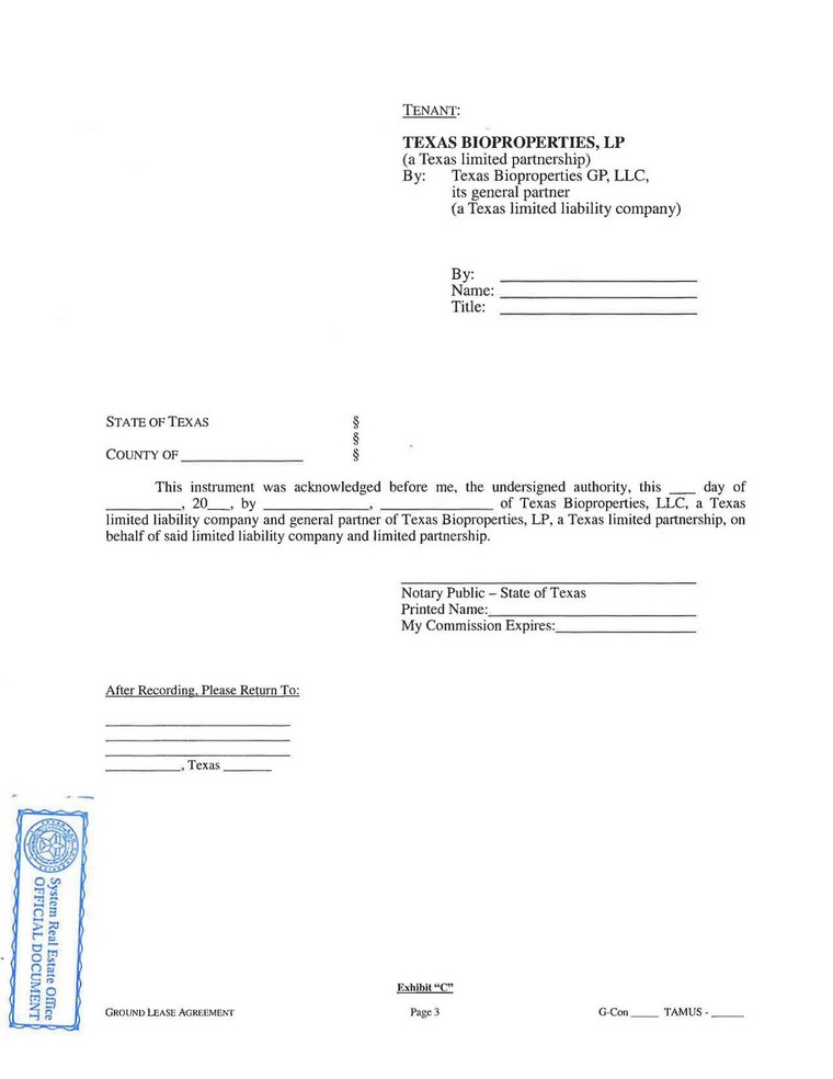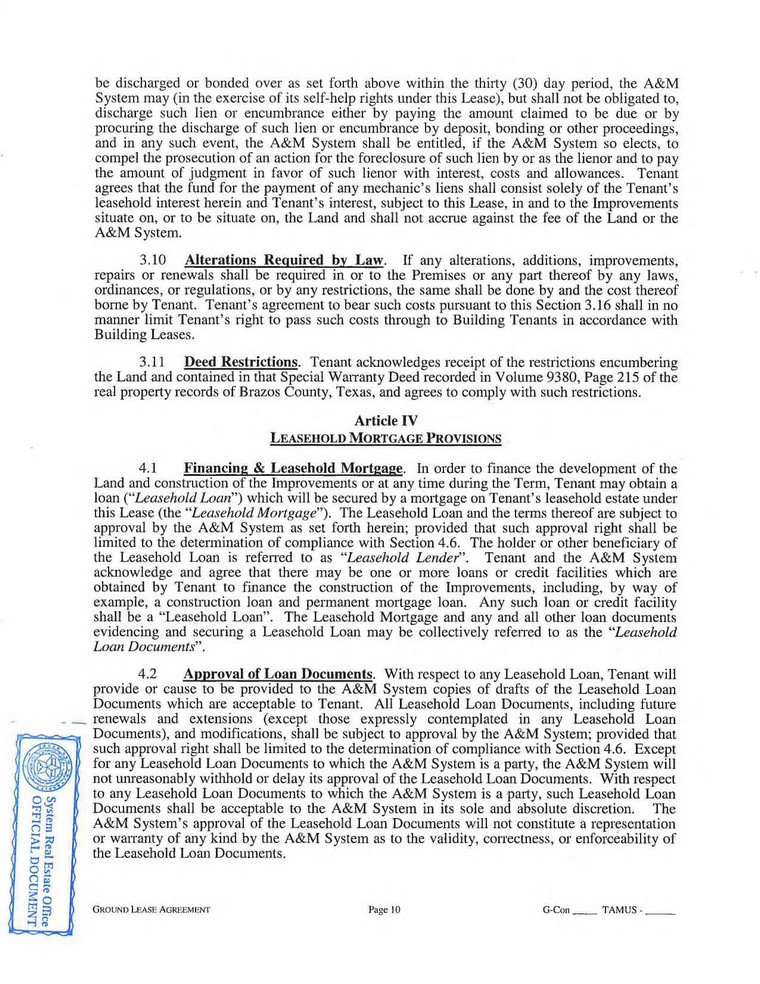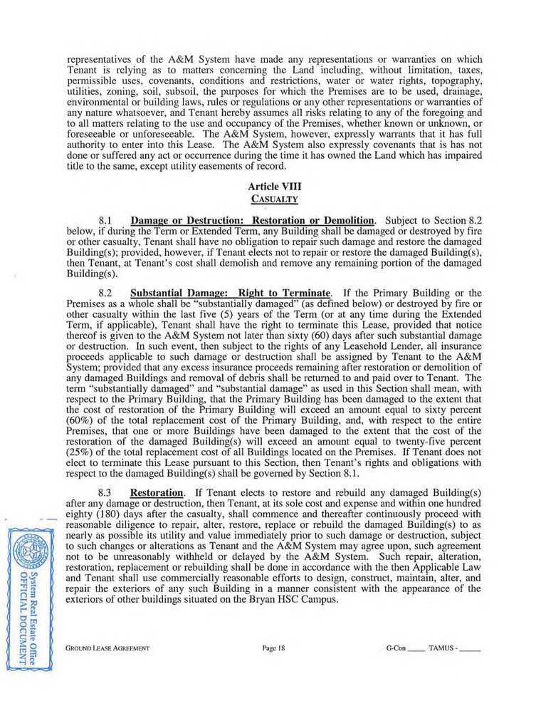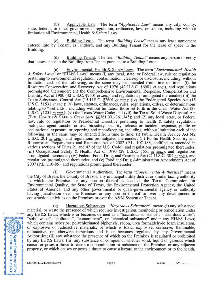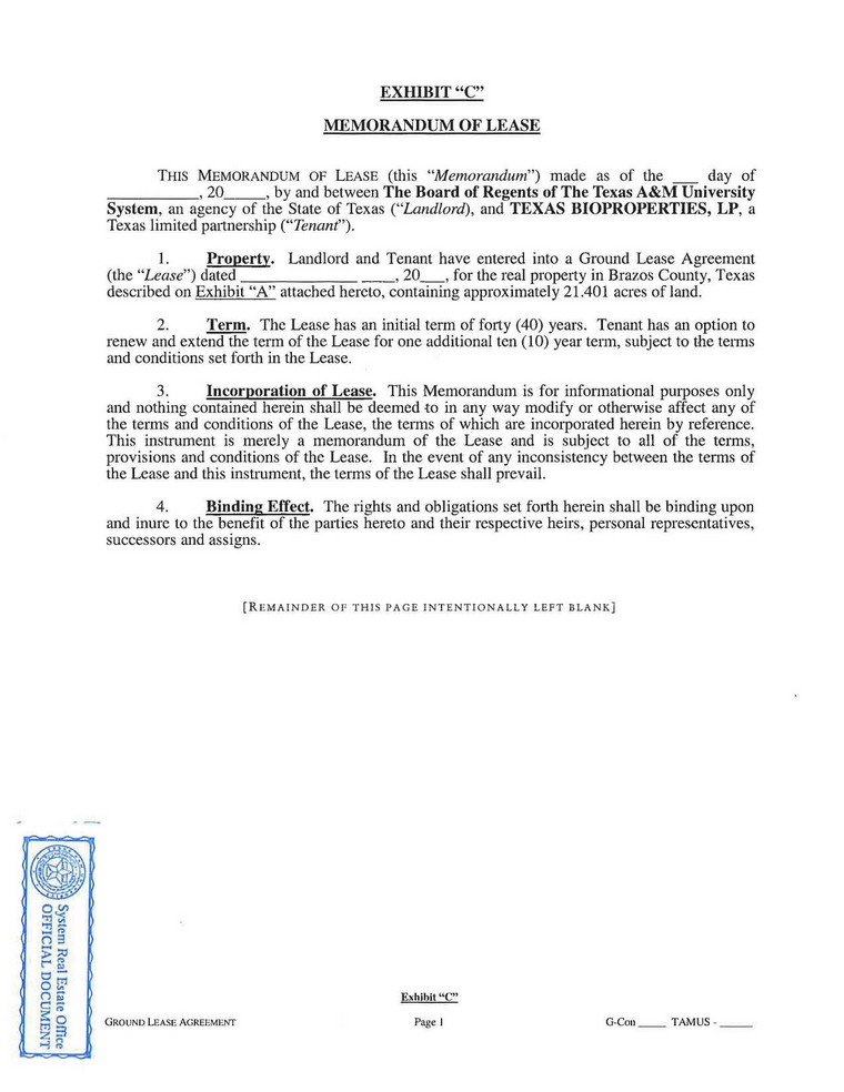 A. College Station is the tenant under the Ground Lease dated March 8, 2010, between The Board of Regents of the Texas A&M University System, an agency of the State of Texas (“A&M”), as landlord, and College Station’s predecessor in interest, as tenant, as amended by the Estoppel Certificate and Amendment to Ground Lease Agreement between A&M and College Station dated December 22, 2015 (together, the “Ground Lease”), related to that certain parcel of real estate located in Brazos County, Texas, as more particularly described on Exhibit A attached hereto (the “Land”).