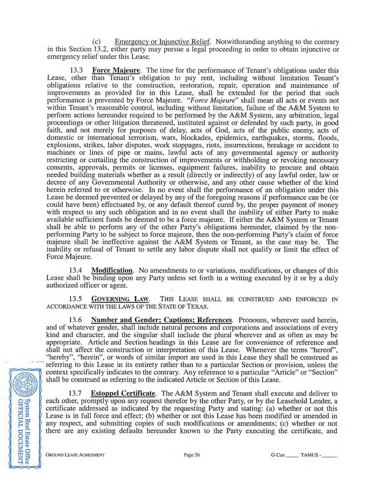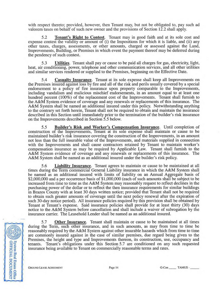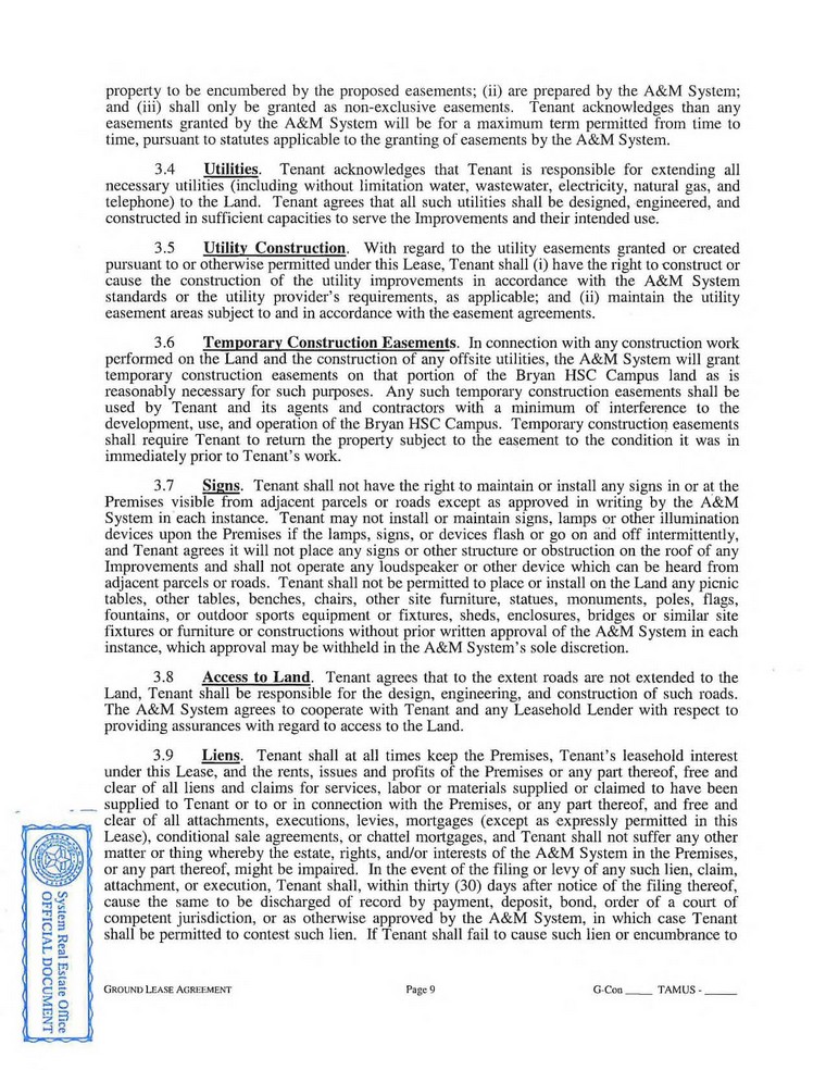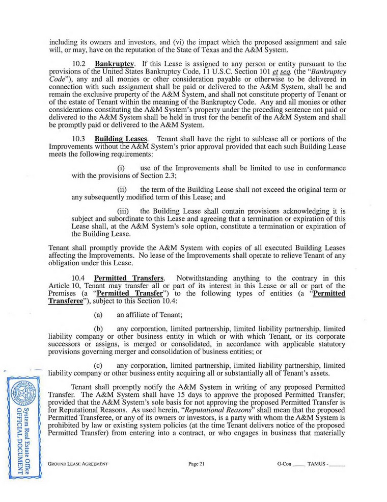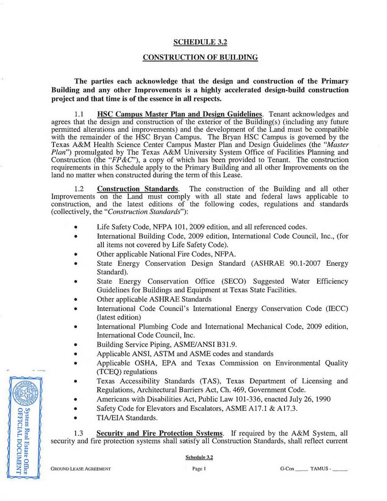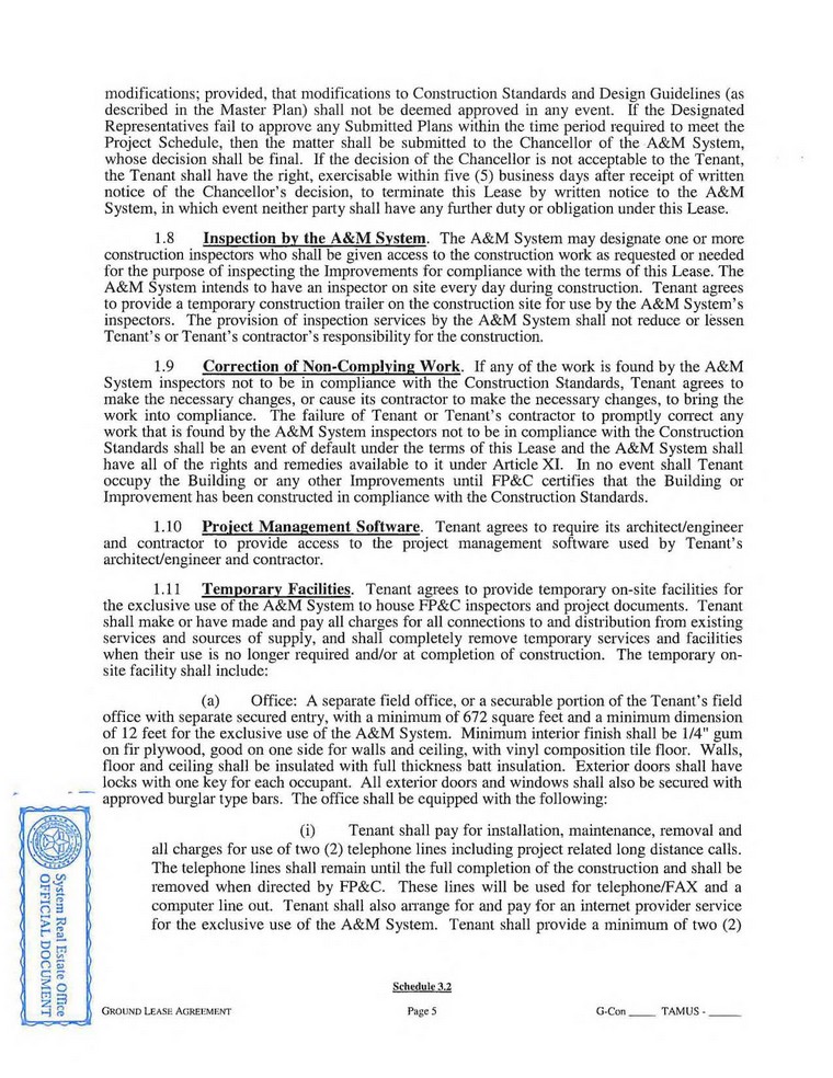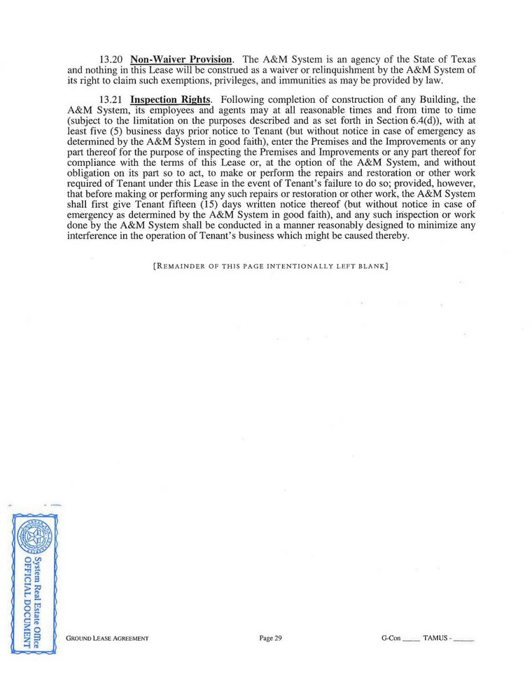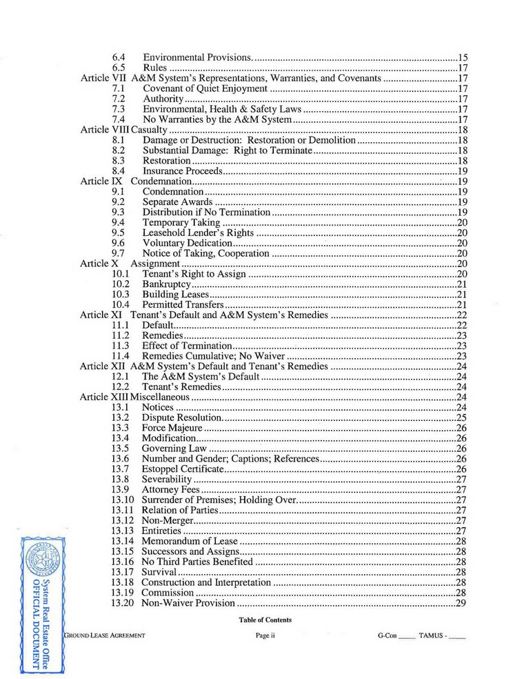 A. College Station is the tenant under the Ground Lease dated March 8, 2010, between The Board of Regents of the Texas A&M University System, an agency of the State of Texas (“A&M”), as landlord, and College Station’s predecessor in interest, as tenant, as amended by the Estoppel Certificate and Amendment to Ground Lease Agreement between A&M and College Station dated December 22, 2015 (together, the “Ground Lease”), related to that certain parcel of real estate located in Brazos County, Texas, as more particularly described on Exhibit A attached hereto (the “Land”).