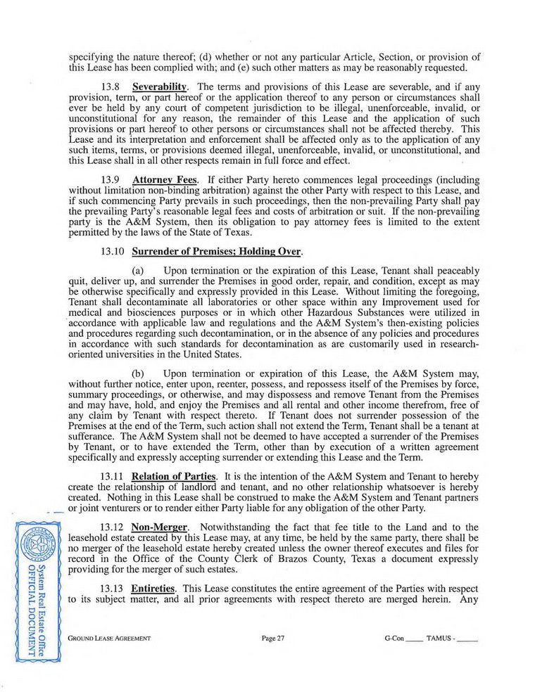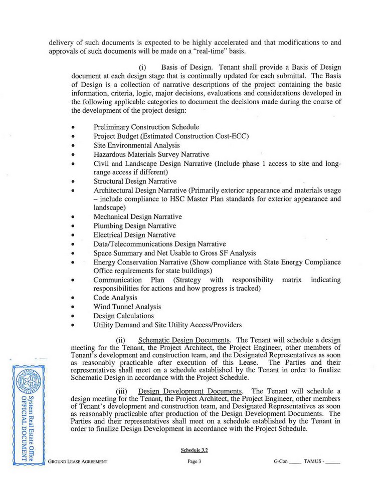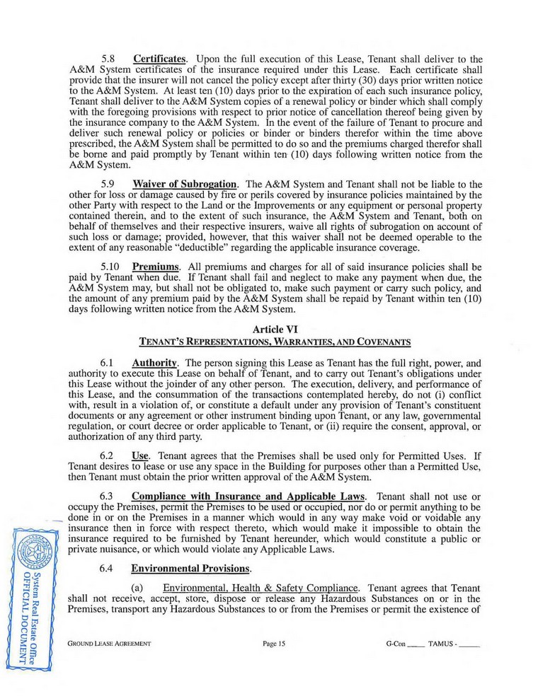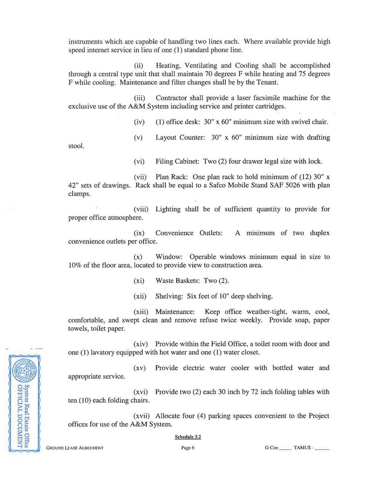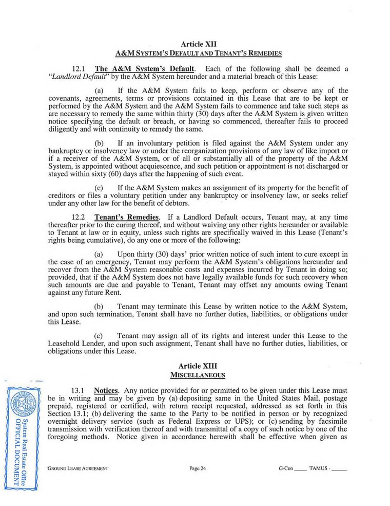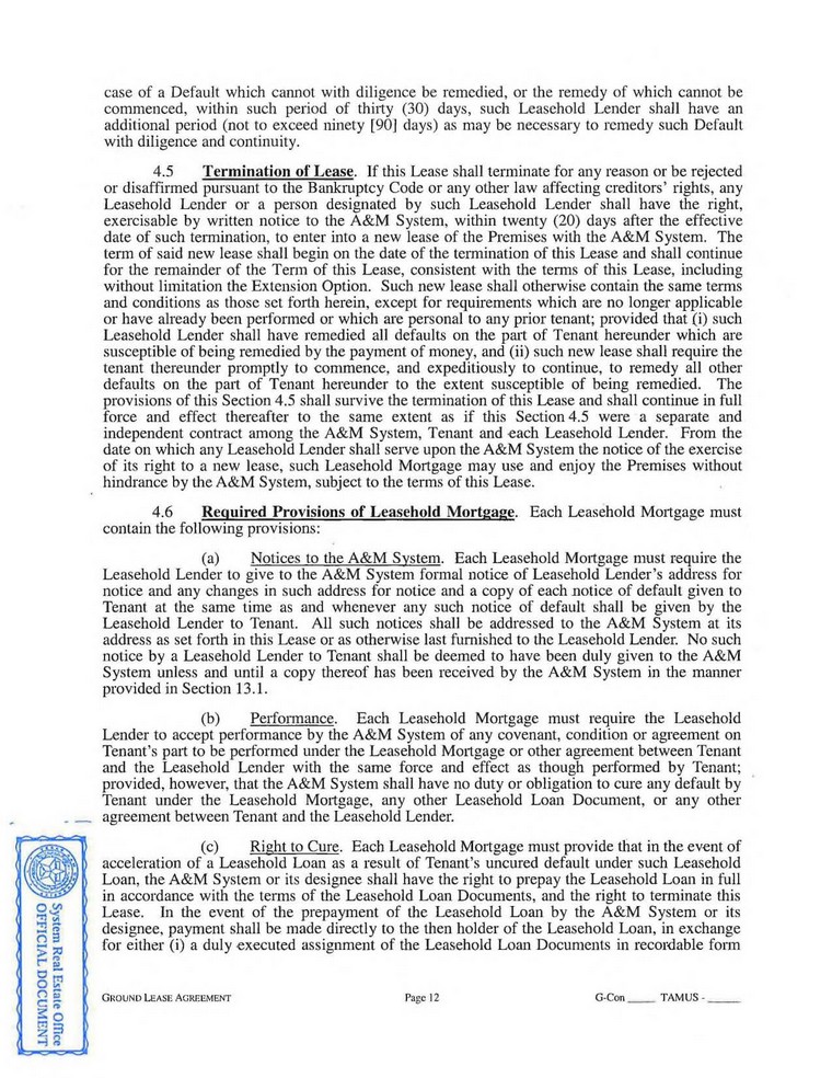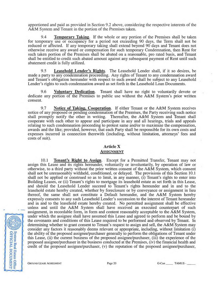 A. College Station is the tenant under the Ground Lease dated March 8, 2010, between The Board of Regents of the Texas A&M University System, an agency of the State of Texas (“A&M”), as landlord, and College Station’s predecessor in interest, as tenant, as amended by the Estoppel Certificate and Amendment to Ground Lease Agreement between A&M and College Station dated December 22, 2015 (together, the “Ground Lease”), related to that certain parcel of real estate located in Brazos County, Texas, as more particularly described on Exhibit A attached hereto (the “Land”).