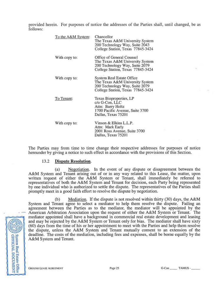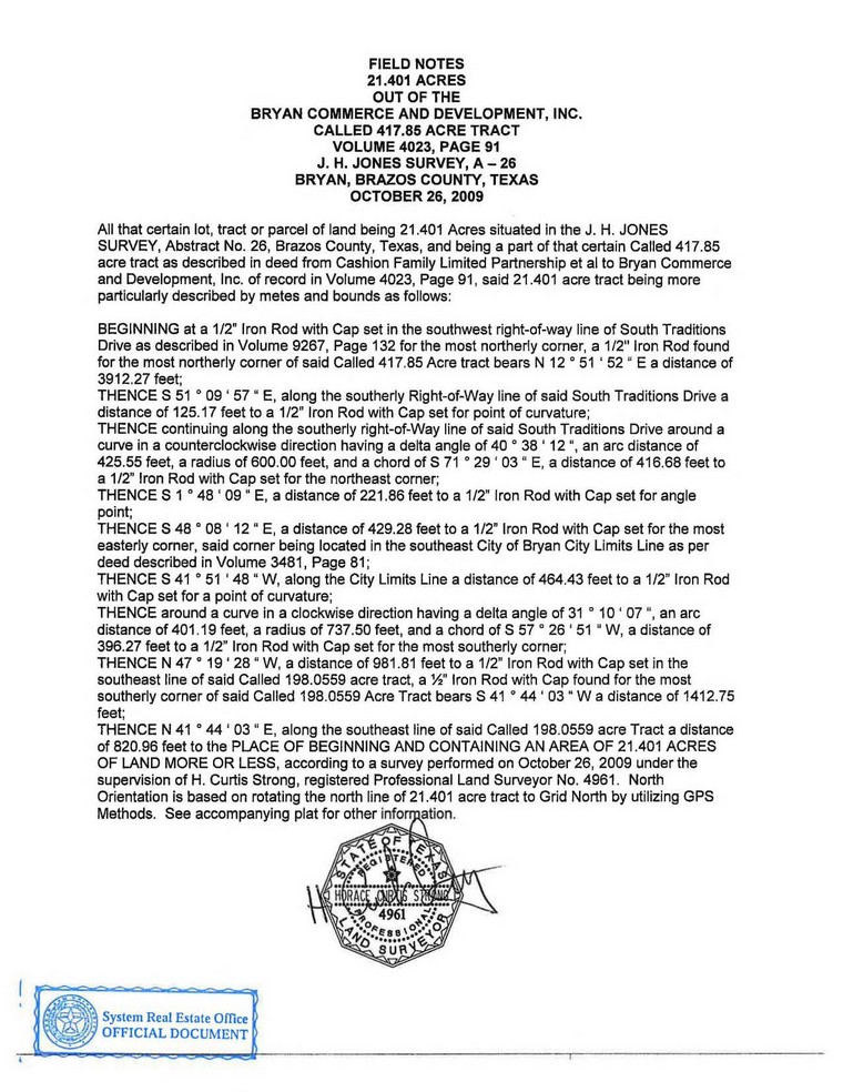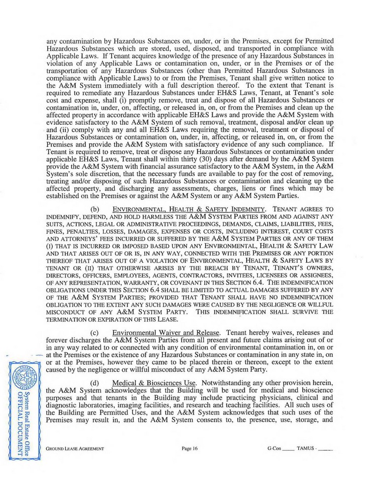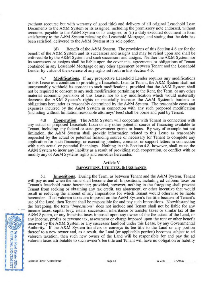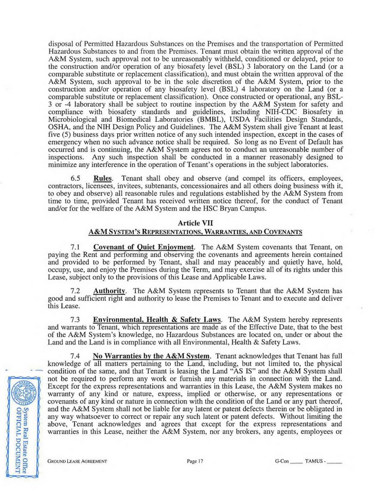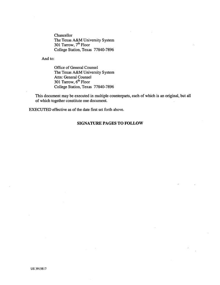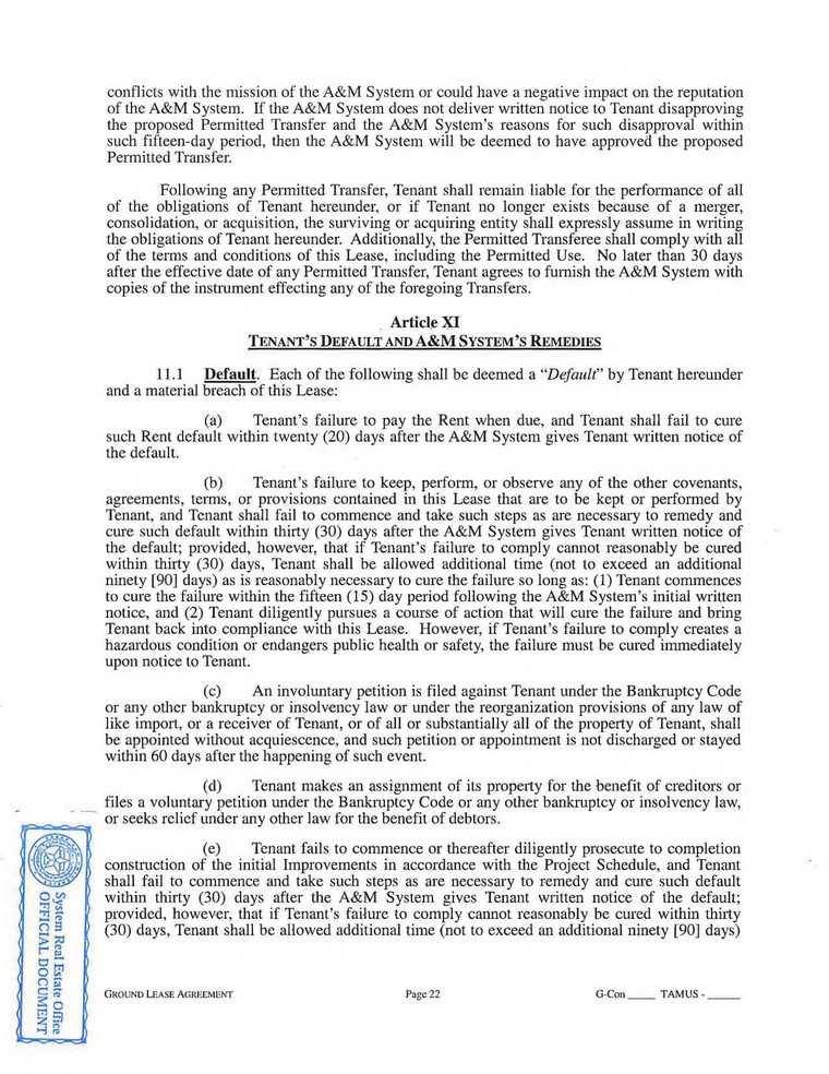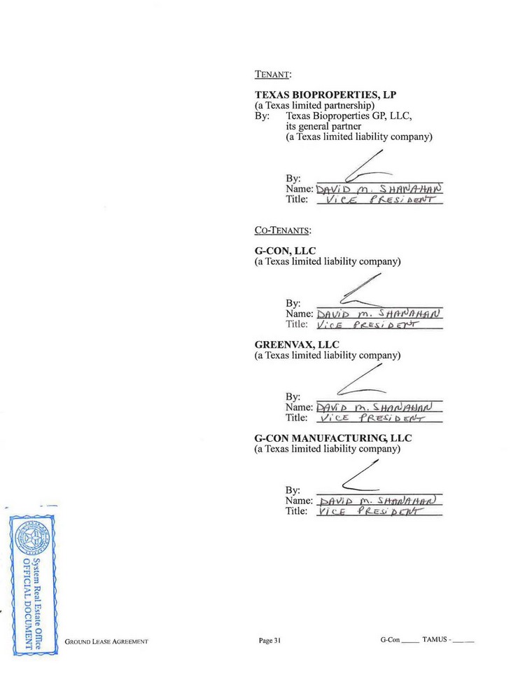 A. College Station is the tenant under the Ground Lease dated March 8, 2010, between The Board of Regents of the Texas A&M University System, an agency of the State of Texas (“A&M”), as landlord, and College Station’s predecessor in interest, as tenant, as amended by the Estoppel Certificate and Amendment to Ground Lease Agreement between A&M and College Station dated December 22, 2015 (together, the “Ground Lease”), related to that certain parcel of real estate located in Brazos County, Texas, as more particularly described on Exhibit A attached hereto (the “Land”).