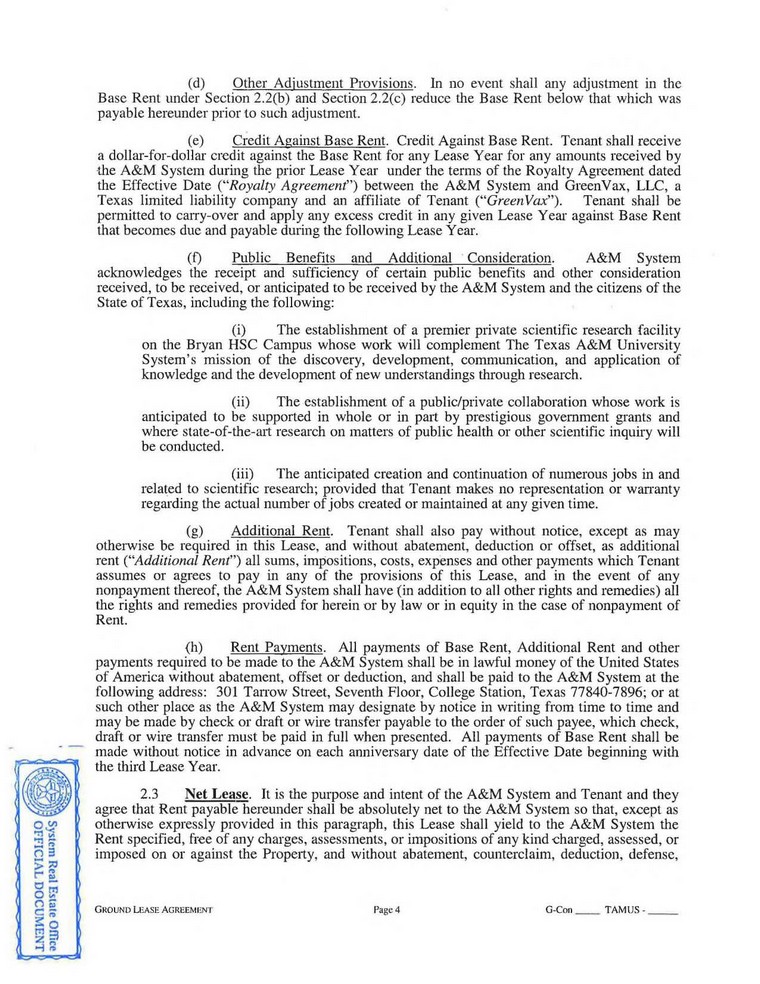. Rent and other amounts payable by College Station under the Ground Lease shall be prorated as of midnight of the day prior to the Closing. College Station shall pay all such rent or other amounts attributable to any period prior to the date upon which the Closing occurs, and CDMO shall pay all such rent and other amounts attributable to any period beginning on or after the date upon which the Closing occurs.
