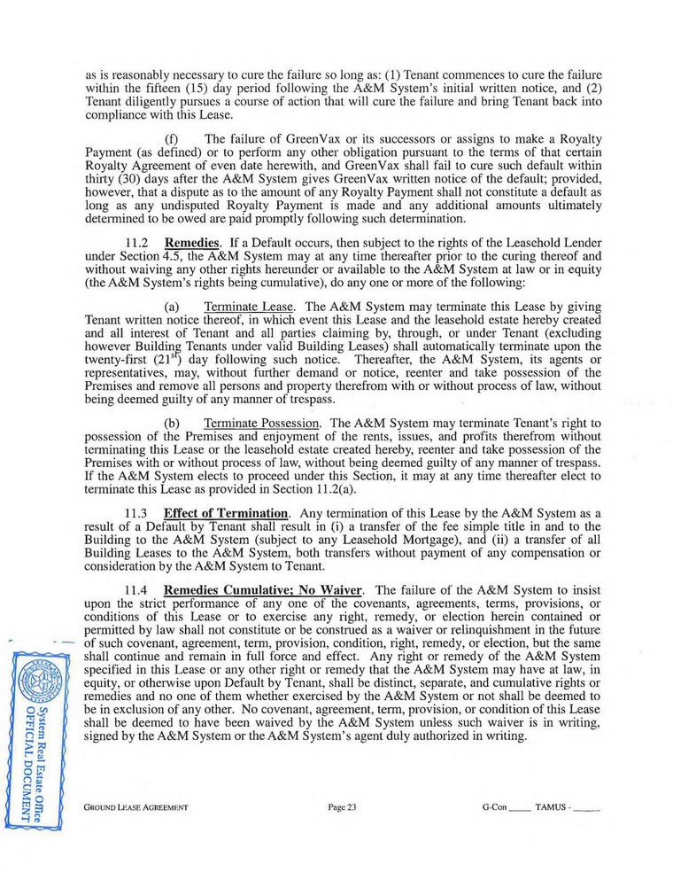. College Station shall convey and CDMO shall accept the Real Property Interest subject to: (i) the specific exceptions (including exceptions that are a part of the promulgated title insurance form) in the Title Commitment that the Title Company has not agreed to remove from the Title Commitment as of the date hereof and that Seller is not required to remove as provided below; (ii) matters created by, through or under Purchaser; (iii) items shown on the Survey which have not been removed as of the date hereof (or if Purchaser does not obtain a survey or an update to the Survey, all matters that a current, accurate survey of the Property would show); (iv) real estate taxes not yet due and payable; (v) all applicable local, state and federal laws, ordinances or governmental regulations, including, but not limited to, building and zoning laws, ordinances and regulations, now or hereafter in effect relating to the Property; (vi) all matters of title relative to the Real Property Interest, except for any monetary liens of an ascertainable amount created by, through, or under Seller (but excluding any matters created by, through, or under Purchaser or its affiliates), which College Station shall remove or release at Closing; (vii) the Ground Lease; and (viii) the Memorandum of Lease between A&M and Texas BioProperties, LP dated March 8, 2010.