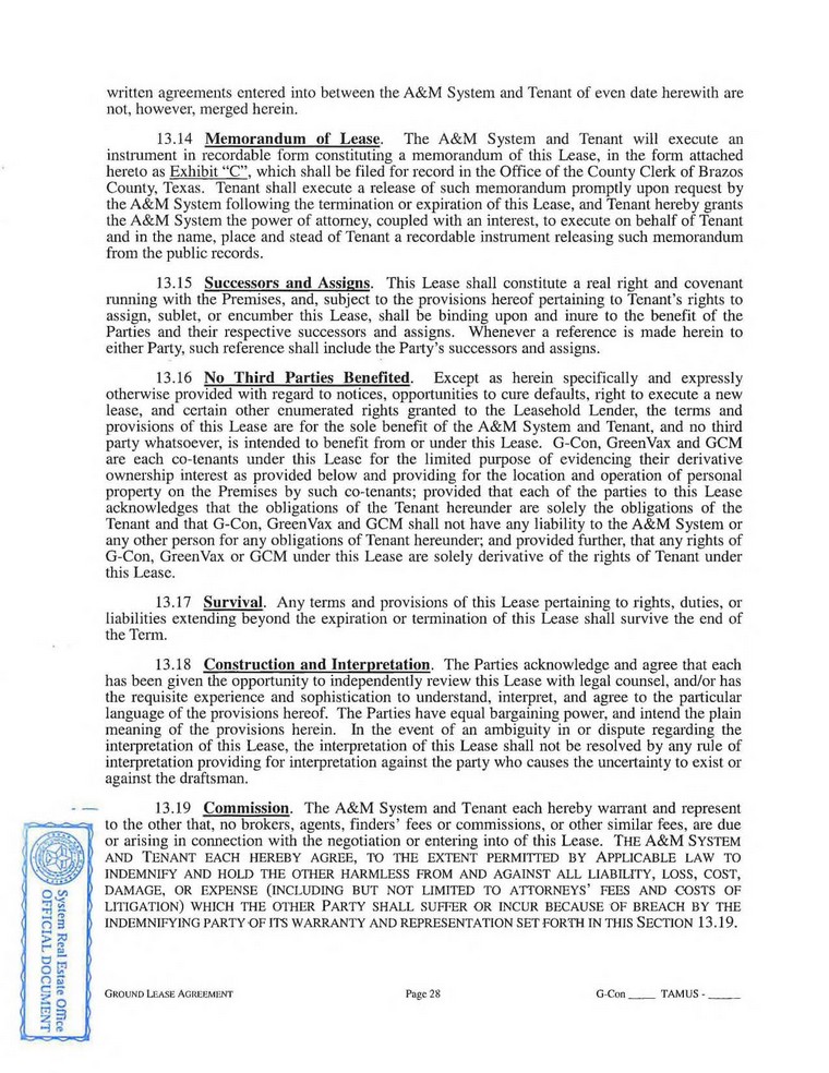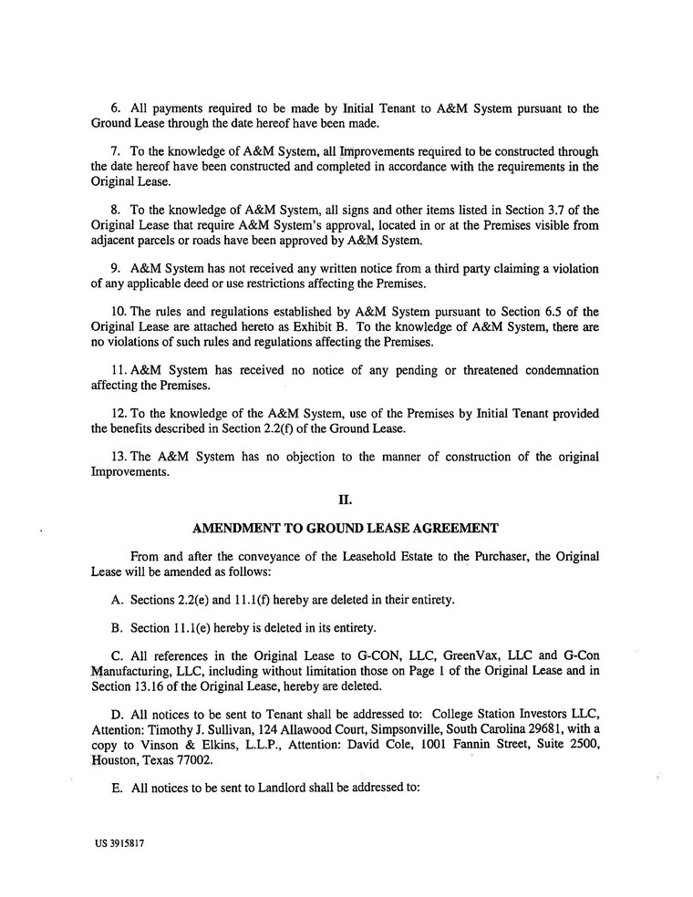 . A Special Warranty Deed and Assignment of Ground Lease in the form of Exhibit C attached hereto, executed and acknowledged by College Station, conveying to CDMO all of College Station’s right, title and interest to the Ground Lease (the “Assignment of Ground Lease”).