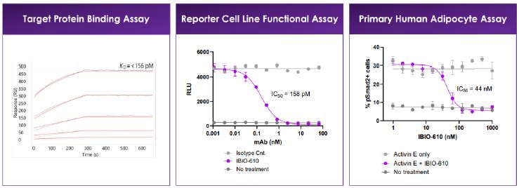 In vitro characterization of IBIO-610. Target protein binding measured via SPR. Reporter cell line assay used HEK293 reporter cell line with ALK7 receptor stably integrated. 200pM Activin E used. Differentiated human adipocyte, treated with 100nM Activin E.