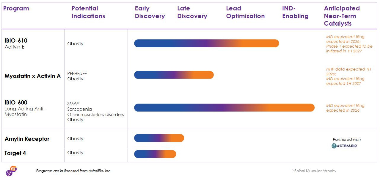 In April 2024, as result of our collaboration with AstralBio, we initiated a program to discover and develop a long-acting anti-myostatin antibody. Using our StableHu platform coupled with mammalian display, we optimized hit antibodies across multiple parameters, including affinity for myostatin, binding to the FcRn receptor, expression levels in mammalian cells, and resistance to poly-reactivity and aggregation. The final candidate, IBIO-600, was also observed to have a beneficial profile between thermostability and resistance to stress conditions during initial testing.