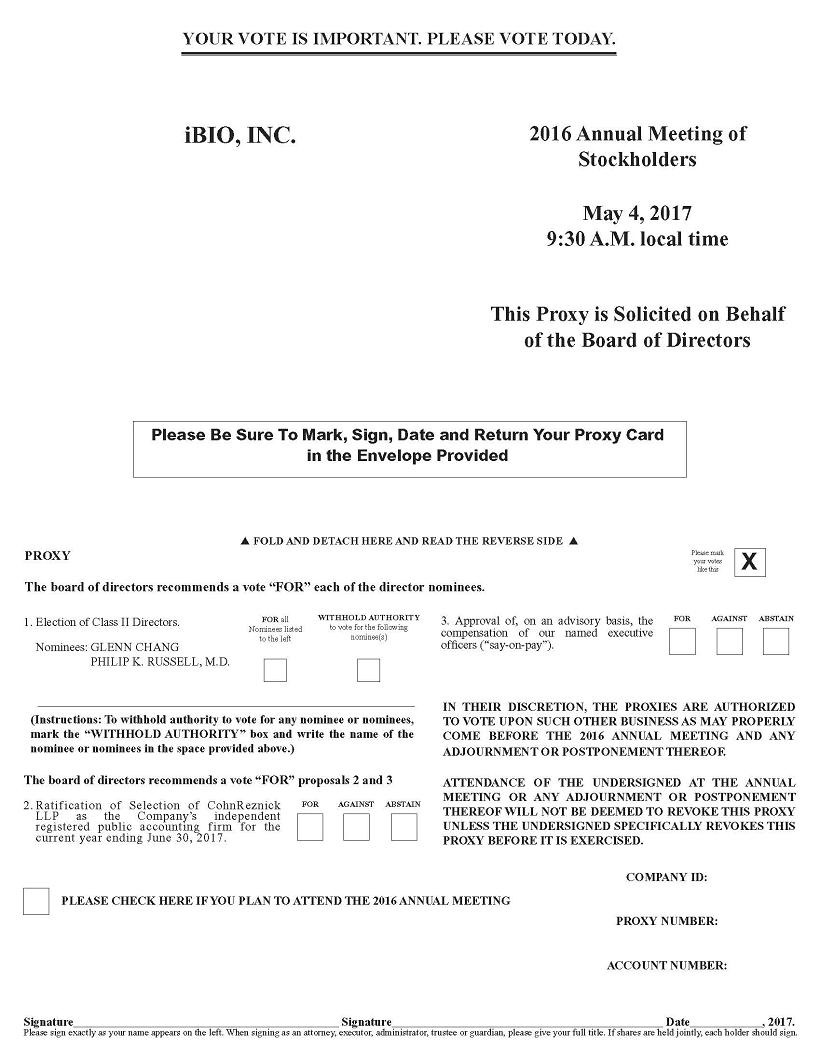 ã FOLD AND DETACH HERE AND READ THE REVERSE SIDE ã YOUR VOTE IS IMPORTANT. PLEASE VOTE TODAY. iBIO, INC. 2016 Annual Meeting of Stockholders May 4, 2017 9:30 A.M. local time This Proxy is Solicited on Behalf of the Board of Directors Please Be Sure To Mark, Sign, Date and Return Your Proxy Card in the Envelope Provided PROXY The board of directors recommends a vote ¡§FOR¡¨ each of the director nominees. Please mark your votes like this X FOR AGAINST ABSTAIN IN THEIR DISCRETION, THE PROXIES ARE AUTHORIZED TO VOTE UPON SUCH OTHER BUSINESS AS MAY PROPERLY COME BEFORE THE 2016 ANNUAL MEETING AND ANY ADJOURNMENT OR POSTPONEMENT THEREOF. ATTENDANCE OF THE UNDERSIGNED AT THE ANNUAL MEETING OR ANY ADJOURNMENT OR POSTPONEMENT THEREOF WILL NOT BE DEEMED TO REVOKE THIS PROXY UNLESS THE UNDERSIGNED SPECIFICALLY REVOKES THIS PROXY BEFORE IT IS EXERCISED. COMPANY ID: PROXY NUMBER: ACCOUNT NUMBER: FOR AGAINST ABSTAIN FOR all Nominees listed to the left WITHHOLD AUTHORITY to vote for the following nominee(s) 1. Election of Class II Directors. Nominees: GLENN CHANG PHILIP K. RUSSELL, M.D. (Instructions: To withhold authority to vote for any nominee or nominees, mark the ¡¥¡¥WITHHOLD AUTHORITY¡¦¡¦ box and write the name of the nominee or nominees in the space provided above.) 2. Ratif ication of Selection of CohnReznick LLP as the Company¡¦s independent registered public accounting firm for the current year ending June 30, 2017. Signature____________________________________________ Signature_____________________________________________ Date____________, 2017. Please sign exactly as your name appears on the left. When signing as an attorney, executor, administrator, trustee or guardian, please give your full title. If shares are held jointly, each holder should sign. The board of directors recommends a vote ¡§FOR¡¨ proposals 2 and 3 PLEASE CHECK HERE IF YOU PLAN TO ATTEND THE 2016 ANNUAL MEETING Fitch Proof 88903 IBio Proxy Card Front 3. Approval of, on an advisory basis, the compensation of our named executive officers (¡§say-on-pay¡¨). 88903_I_BIO_PROXY-CARD.indd 1 4/3/17 4:42 PM