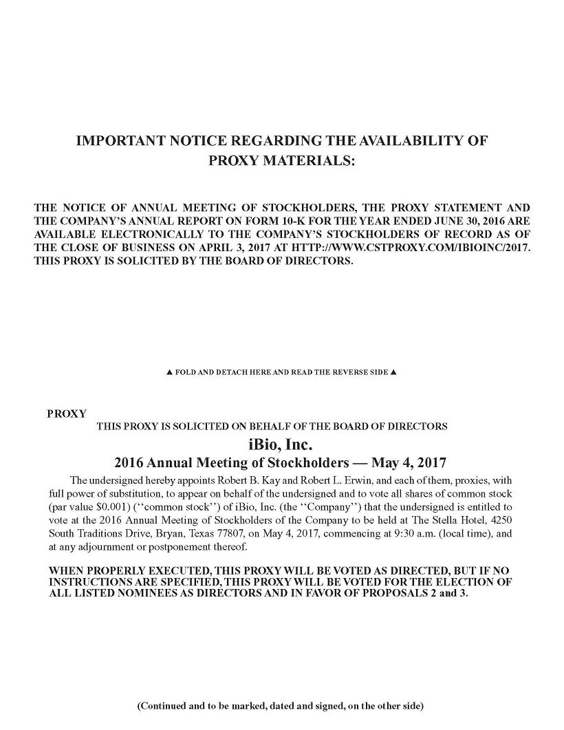 ã FOLD AND DETACH HERE AND READ THE REVERSE SIDE ã IMPORTANT NOTICE REGARDING THE AVAILABILITY OF PROXY MATERIALS: THE NOTICE OF ANNUAL MEETING OF STOCKHOLDERS, THE PROXY STATEMENT AND THE COMPANY¡¦S ANNUAL REPORT ON FORM 10-K FOR THE YEAR ENDED JUNE 30, 2016 ARE AVAILABLE ELECTRONICALLY TO THE COMPANY¡¦S STOCKHOLDERS OF RECORD AS OF THE CLOSE OF BUSINESS ON APRIL 3, 2017 AT HTTP://WWW.CSTPROXY.COM/IBIOINC/2017. THIS PROXY IS SOLICITED BY THE BOARD OF DIRECTORS. iBio, Inc. 2016 Annual Meeting of Stockholders ¡X May 4, 2017 PROXY THIS PROXY IS SOLICITED ON BEHALF OF THE BOARD OF DIRECTORS The undersigned hereby appoints Robert B. Kay and Robert L. Erwin, and each of them, proxies, with full power of substitution, to appear on behalf of the undersigned and to vote all shares of common stock (par value $0.001) (¡¥¡¥common stock¡¦¡¦) of iBio, Inc. (the ¡¥¡¥Company¡¦¡¦) that the undersigned is entitled to vote at the 2016 Annual Meeting of Stockholders of the Company to be held at The Stella Hotel, 4250 South Traditions Drive, Bryan, Texas 77807, on May 4, 2017, commencing at 9:30 a.m. (local time), and at any adjournment or postponement thereof. WHEN PROPERLY EXECUTED, THIS PROXY WILL BE VOTED AS DIRECTED, BUT IF NO INSTRUCTIONS ARE SPECIFIED, THIS PROXY WILL BE VOTED FOR THE ELECTION OF ALL LISTED NOMINEES AS DIRECTORS AND IN FAVOR OF PROPOSALS 2 and 3. (Continued and to be marked, dated and signed, on the other side) Fitch Proof 88903 IBio Proxy Card Back 88903_I_BIO_PROXY-CARD.indd 2 4/3/17 4:42 PM