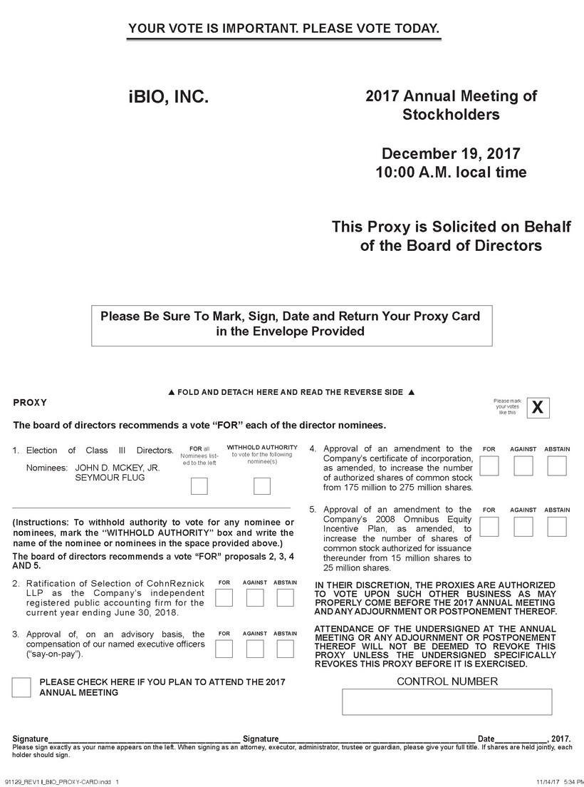 YOUR VOTE IS IMPORTANT. PLEASE VOTE TODAY. iBIO, INC. 2017 Annual Meeting of Stockholders December 19, 2017 10:00 A.M. local time This Proxy is Solicited on Behalf of the Board of Directors Please Be Sure To Mark, Sign, Date and Return Your Proxy Card in the Envelope Provided PROXY The board of directors recommends a vote “FOR” each of the director nominees. Please mark your votes like this X FOR AGAINST ABSTAIN FOR AGAINST ABSTAIN FOR AGAINST ABSTAIN FOR AGAINST ABSTAIN IN THEIR DISCRETION, THE PROXIES ARE AUTHORIZED TO VOTE UPON SUCH OTHER BUSINESS AS MAY PROPERLY COME BEFORE THE 2017 ANNUAL MEETING AND ANY ADJOURNMENT OR POSTPONEMENT THEREOF. ATTENDANCE OF THE UNDERSIGNED AT THE ANNUAL MEETING OR ANY ADJOURNMENT OR POSTPONEMENT THEREOF WILL NOT BE DEEMED TO REVOKE THIS PROXY UNLESS THE UNDERSIGNED SPECIFICALLY REVOKES THIS PROXY BEFORE IT IS EXERCISED. FOR all Nominees listed to the left WITHHOLD AUTHORITY to vote for the following nominee(s) 1. Election of Class III Directors. Nominees: JOHN D. MCKEY, JR. SEYMOUR FLUG (Instructions: To withhold authority to vote for any nominee or nominees, mark the ‘‘WITHHOLD AUTHORITY’’ box and write the name of the nominee or nominees in the space provided above.) 2. Ratification of Selection of CohnReznick LLP as the Company’s independent registered public accounting firm for the current year ending June 30, 2018. Signature____________________________________________ Signature_____________________________________________ Date____________, 2017. Please sign exactly as your name appears on the left. When signing as an attorney, executor, administrator, trustee or guardian, please give your full title. If shares are held jointly, each holder should sign. The board of directors recommends a vote “FOR” proposals 2, 3, 4 AND 5. PLEASE CHECK HERE IF YOU PLAN TO ATTEND THE 2017 ANNUAL MEETING 3. Approval of, on an advisory basis, the compensation of our named executive officers (“say-on-pay”). 4. Approval of an amendment to the Company’s certificate of incorporation, as amended, to increase the number of authorized shares of common stock from 175 million to 275 million shares. 5. Approval of an amendment to the Company’s 2008 Omnibus Equity Incentive Plan, as amended, to increase the number of shares of common stock authorized for issuance thereunder from 15 million shares to 25 million shares. CONTROL NUMBER 91129_REV1 I_BIO_PROXY-CARD.indd 1