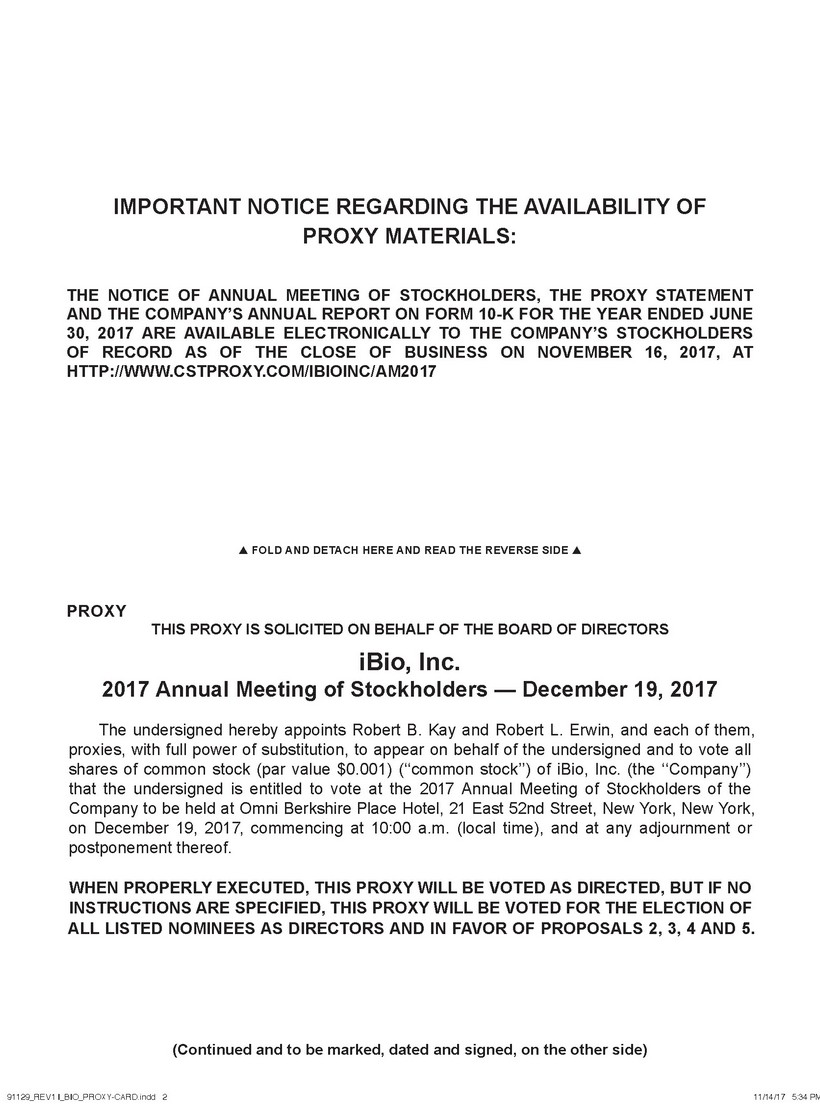 IMPORTANT NOTICE REGARDING THE AVAILABILITY OF PROXY MATERIALS: THE NOTICE OF ANNUAL MEETING OF STOCKHOLDERS, THE PROXY STATEMENT AND THE COMPANY’S ANNUAL REPORT ON FORM 10-K FOR THE YEAR ENDED JUNE 30, 2017 ARE AVAILABLE ELECTRONICALLY TO THE COMPANY’S STOCKHOLDERS OF RECORD AS OF THE CLOSE OF BUSINESS ON NOVEMBER 16, 2017, AT HTTP://WWW.CSTPROXY.COM/IBIOINC/AM2017 iBio, Inc. 2017 Annual Meeting of Stockholders — December 19, 2017 PROXY THIS PROXY IS SOLICITED ON BEHALF OF THE BOARD OF DIRECTORS The undersigned hereby appoints Robert B. Kay and Robert L. Erwin, and each of them, proxies, with full power of substitution, to appear on behalf of the undersigned and to vote all shares of common stock (par value $0.001) (‘‘common stock’’) of iBio, Inc. (the ‘‘Company’’) that the undersigned is entitled to vote at the 2017 Annual Meeting of Stockholders of the Company to be held at Omni Berkshire Place Hotel, 21 East 52nd Street, New York, New York, on December 19, 2017, commencing at 10:00 a.m. (local time), and at any adjournment or postponement thereof. WHEN PROPERLY EXECUTED, THIS PROXY WILL BE VOTED AS DIRECTED, BUT IF NO INSTRUCTIONS ARE SPECIFIED, THIS PROXY WILL BE VOTED FOR THE ELECTION OF ALL LISTED NOMINEES AS DIRECTORS AND IN FAVOR OF PROPOSALS 2, 3, 4 AND 5. (Continued and to be marked, dated and signed, on the other side) 91129_REV1 I_BIO_PROXY-CARD.indd 2 11