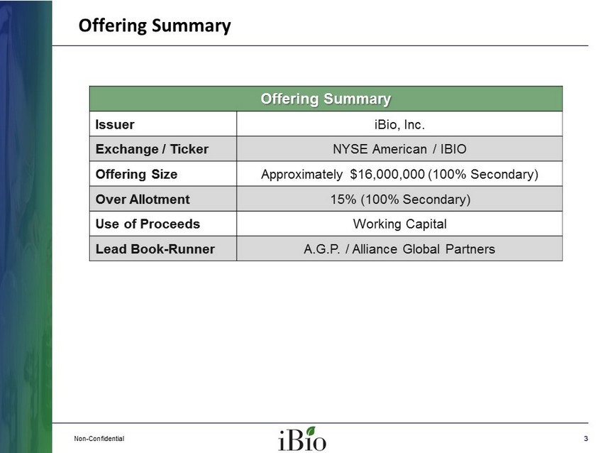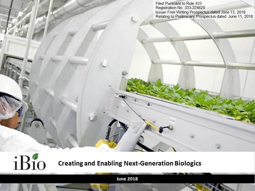 2 2 2 • Issuer Free Writing Prospectus Issued Pursuant to SEC Rule 433 • This free writing prospectus relates to the proposed public offering of Series A Preferred Stock and Common Stock of iBio , Inc. (the “Company”) all of which are being registered on a Registration Statement on Form S - 1 (No. 333 - 224620) (the “Registration Statement”). This free writing prospectus should be read together with the preliminary prospectus dated June 11, 2018 included in that Registration Statement, which can be accessed through the following link: https://www.sec.gov/Archives/edgar/data/1420720/000114420418033666/tv4 96227_s1a.htm#a_017 • Before you invest, you should read the preliminary prospectus in that registration statement (including the risk factors described therein) and other documents the Company has filed with the SEC for more complete information about the Company and this offering. You may get these documents for free by visiting EDGAR on the SEC Web site at www.sec.gov . Alternatively, the Company, any underwriter or any dealer participating in the offering will arrange to send you the prospectus if you request it by calling: [Toll Free AGP #]. Non - Confidential 2