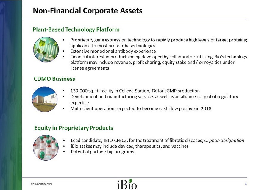 3 Offering Summary Non - Confidential 3 Offering Summary Issuer iBio, Inc. Exchange / Ticker NYSE American / IBIO Offering Size Approximately $16,000,000 (100% Secondary) Over Allotment 15% (100% Secondary) Use of Proceeds Working Capital Lead Book - Runner A.G.P. / Alliance Global Partners