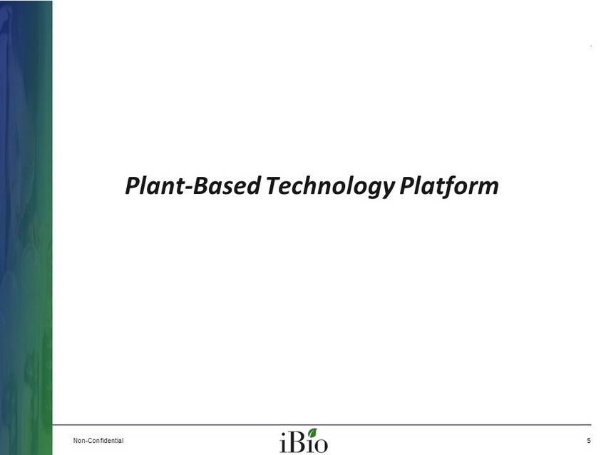 4 Non - Confidential 4 Non - Financial Corporate Assets Plant - Based Technology Platform • Proprietary gene expression technology to rapidly produce high levels of target proteins; applicable to most protein - based biologics • Extensive monoclonal antibody experience • Financial interest in products being developed by collaborators utilizing iBio’s technology platform may include revenue, profit sharing, equity stake and / or royalties under license agreements CDMO Business • 139,000 sq. ft. facility in College Station, TX for cGMP production • Development and manufacturing services as well as an alliance for global regulatory expertise • Multi - client operations expected to become cash flow positive in 2018 Equity in Proprietary Products • Lead candidate, IBIO - CFB03, for the treatment of fibrotic diseases; Orphan designation • iBio stakes may include devices, therapeutics, and vaccines • Potential partnership programs