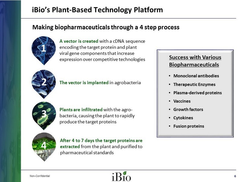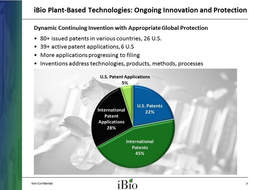 6 iBio’s Plant - Based Technology Platform Non - Confidential 6 A vector is created with a cDNA sequence encoding the target protein and plant viral gene components that increase expression over competitive technologies The vector is implanted in agrobacteria Plants are infiltrated with the agro - bacteria, causing the plant to rapidly produce the target proteins After 4 to 7 days the target proteins are extracted from the plant and purified to pharmaceutical standards 1 2 3 4 • Monoclonal antibodies • Therapeutic Enzymes • Plasma - derived proteins • Vaccines • Growth factors • Cytokines • Fusion proteins Success with Various Biopharmaceuticals Making biopharmaceuticals through a 4 step process