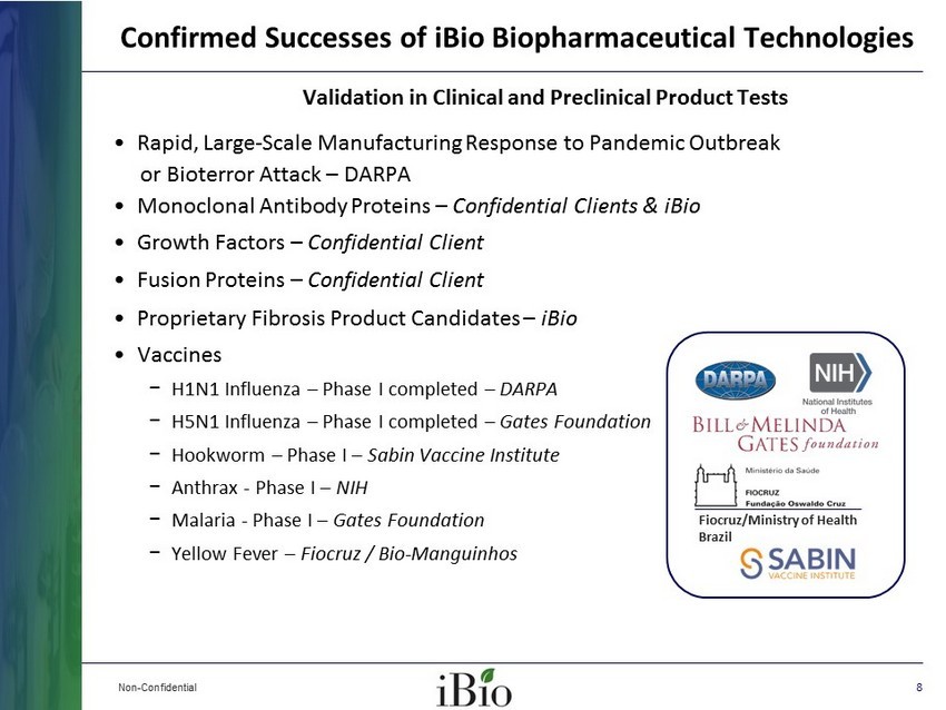 7 7 iBio Plant - Based Technologies: Ongoing Innovation and Protection Non - Confidential 7 Dynamic Continuing Invention with Appropriate Global Protection • 80+ issued patents in various countries, 26 U.S. • 39+ active patent applications, 6 U.S • More applications progressing to filing • Inventions address technologies, products, methods, processes U.S. Patent Applications 5%
