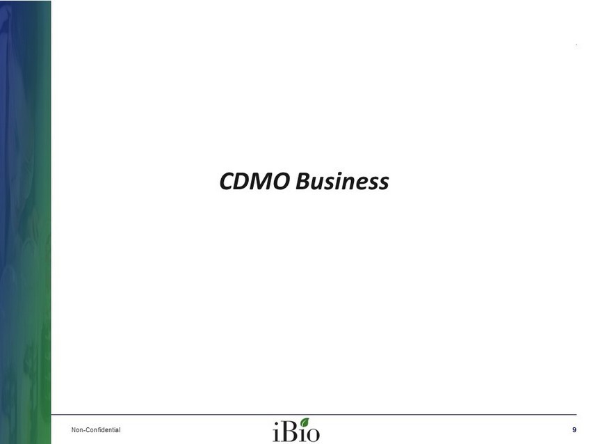 Confirmed Successes of iBio Biopharmaceutical Technologies Validation in Clinical and Preclinical Product Tests • Rapid, Large - Scale Manufacturing Response to Pandemic Outbreak or Bioterror Attack – DARPA • Monoclonal Antibody Proteins – Confidential Clients & iBio • Growth Factors – Confidential Client • Fusion Proteins – Confidential Client • Proprietary Fibrosis Product Candidates – iBio • Vaccines − H1N1 Influenza – Phase I completed – DARPA − H5N1 Influenza – Phase I completed – Gates Foundation − Hookworm – Phase I – Sabin Vaccine Institute − Anthrax - Phase I – NIH − Malaria - Phase I – Gates Foundation − Yellow Fever – Fiocruz / Bio - Manguinhos Non - Confidential 8 Fiocruz/Ministry of Health Brazil