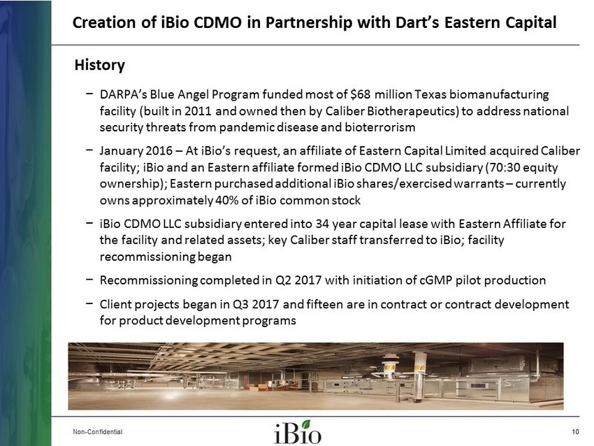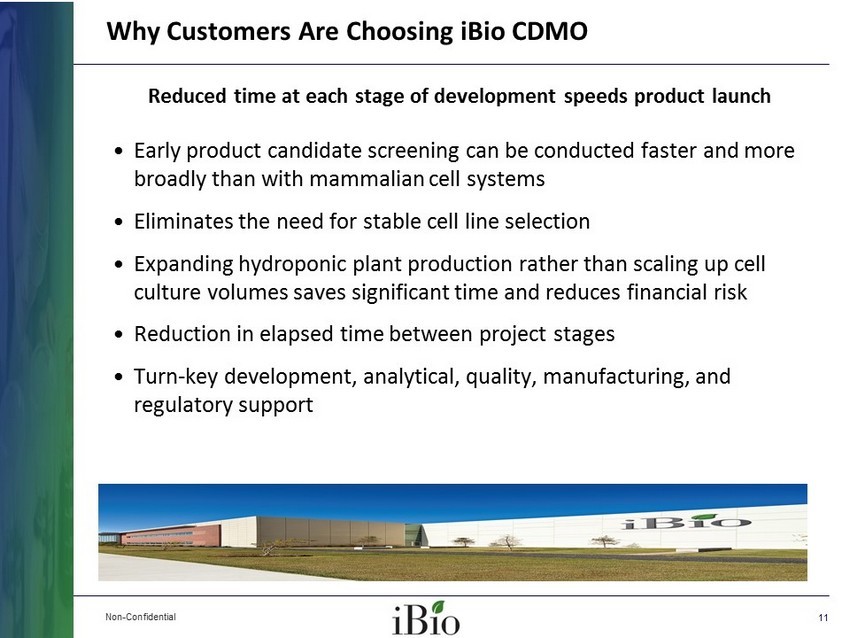 Creation of iBio CDMO in Partnership with Dart’s Eastern Capital History − DARPA’s Blue Angel Program funded most of $68 million Texas biomanufacturing facility (built in 2011 and owned then by Caliber Biotherapeutics) to address national security threats from pandemic disease and bioterrorism − January 2016 – At iBio’s request, an affiliate of Eastern Capital Limited acquired Caliber facility; iBio and an Eastern affiliate formed iBio CDMO LLC subsidiary (70:30 equity ownership); Eastern purchased additional iBio shares/exercised warrants – currently owns approximately 40% of iBio common stock − iBio CDMO LLC subsidiary entered into 34 year capital lease with Eastern Affiliate for the facility and related assets; key Caliber staff transferred to iBio; facility recommissioning began − Recommissioning completed in Q2 2017 with initiation of cGMP pilot production − Client projects began in Q3 2017 and fifteen are in contract or contract development for product development programs Non - Confidential 10