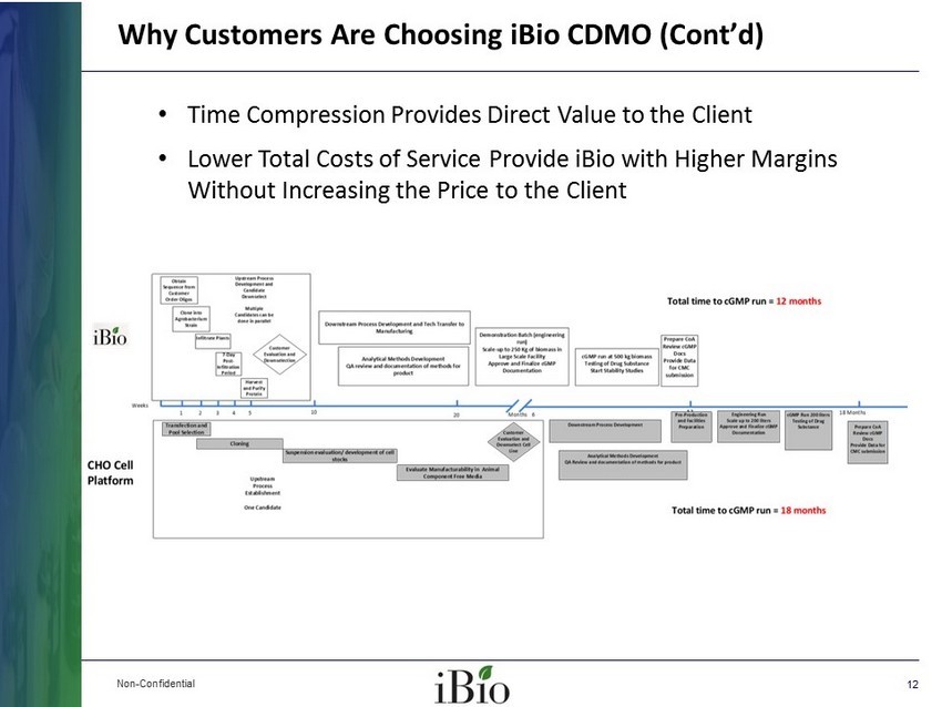 Why Customers Are Choosing iBio CDMO Reduced time at each stage of development speeds product launch • Early product candidate screening can be conducted faster and more broadly than with mammalian cell systems • Eliminates the need for stable cell line selection • Expanding hydroponic plant production rather than scaling up cell culture volumes saves significant time and reduces financial risk • Reduction in elapsed time between project stages • Turn - key development, analytical, quality, manufacturing, and regulatory support Non - Confidential 11