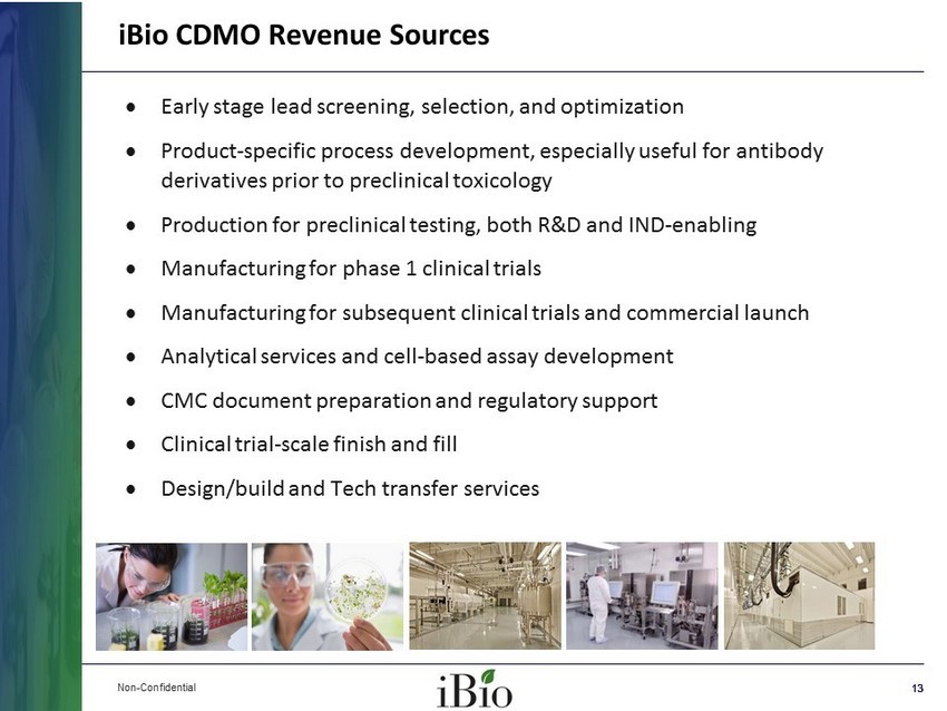 Why Customers Are Choosing iBio CDMO (Cont’d) Non - Confidential 12 • Time Compression Provides Direct Value to the Client • Lower Total Costs of Service Provide iBio with Higher Margins Without Increasing the Price to the Client