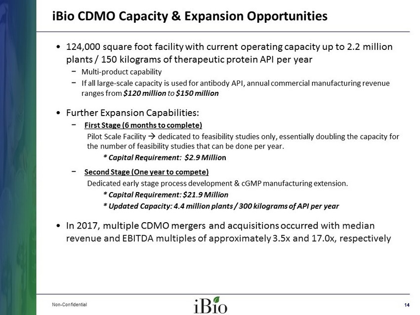 13 13 iBio CDMO Revenue Sources Early stage lead screening, selection, and optimization Product - specific process development, especially useful for antibody derivatives prior to preclinical toxicology Production for preclinical testing, both R&D and IND - enabling Manufacturing for phase 1 clinical trials Manufacturing for subsequent clinical trials and commercial launch Analytical services and cell - based assay development CMC document preparation and regulatory support Clinical trial - scale finish and fill Design/build and Tech transfer services Non - Confidential 13