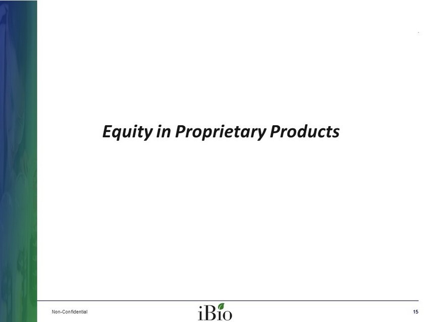 14 14 iBio CDMO Capacity & Expansion Opportunities • 124,000 square foot facility with current operating capacity up to 2.2 million plants / 150 kilograms of therapeutic protein API per year − Multi - product capability − If all large - scale capacity is used for antibody API, annual commercial manufacturing revenue ranges from $120 million to $150 million • Further Expansion Capabilities: − First Stage (6 months to complete) Pilot Scale Facility dedicated to feasibility studies only, essentially doubling the capacity for the number of feasibility studies that can be done per year. * Capital Requirement: $2.9 Millio n − Second Stage (One year to compete) Dedicated early stage process development & cGMP manufacturing extension. * Capital Requirement: $21.9 Million * Updated Capacity: 4.4 million plants / 300 kilograms of API per year • In 2017, multiple CDMO mergers and acquisitions occurred with median revenue and EBITDA multiples of approximately 3.5x and 17.0x, respectively Non - Confidential 14