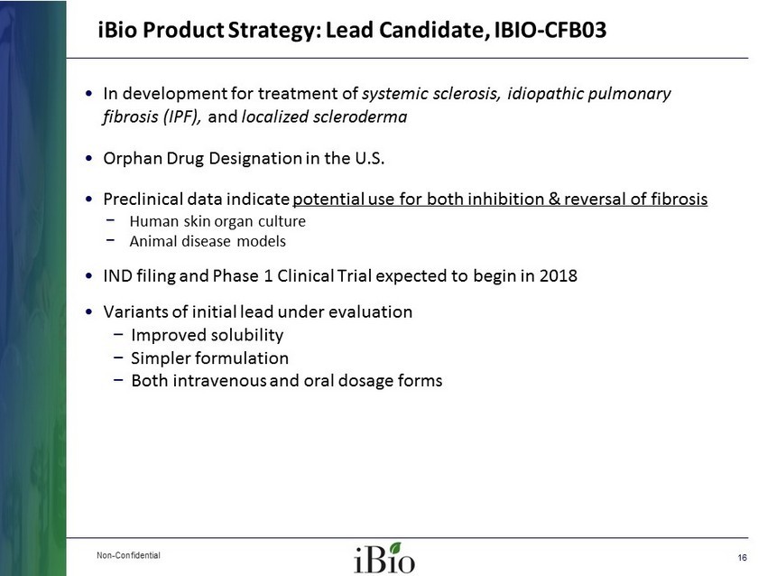 iBio Product Strategy: Lead Candidate, IBIO - CFB03 • In development for treatment of systemic sclerosis, idiopathic pulmonary fibrosis (IPF), and localized scleroderma • Orphan Drug Designation in the U.S. • Preclinical data indicate potential use for both inhibition & reversal of fibrosis − Human skin organ culture − Animal disease models • IND filing and Phase 1 Clinical Trial expected to begin in 2018 • Variants of initial lead under evaluation − Improved solubility − Simpler formulation − Both intravenous and oral dosage forms 16 Non - Confidential