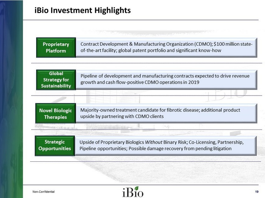 19 19 iBio Investment Highlights Non - Confidential 19 Proprietary Platform Contract Development & Manufacturing Organization (CDMO); $100 million state - of - the - art facility; global patent portfolio and significant know - how Majority - owned treatment candidate for fibrotic disease; additional product upside by partnering with CDMO clients Pipeline of development and manufacturing contracts expected to drive revenue growth and cash flow - positive CDMO operations in 2019 Novel Biologic Therapies Global Strategy for Sustainability Strategic Opportunities Upside of Proprietary Biologics Without Binary Risk; Co - Licensing, Partnership, Pipeline opportunities; Possible damage recovery from pending litigation