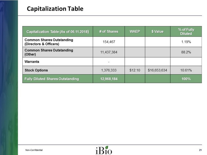 iBio Projected Milestones Positive Cash Flow iBio CDMO Operation within 2018 20 Non - Confidential TImeline 2018 2019 2020 2021 New CDMO Contracts Collaborative Product Development Agreements Expand Business Agreements in Emerging Markets Initiate Phase 1 Clinical Trial of IBIO - CFB03