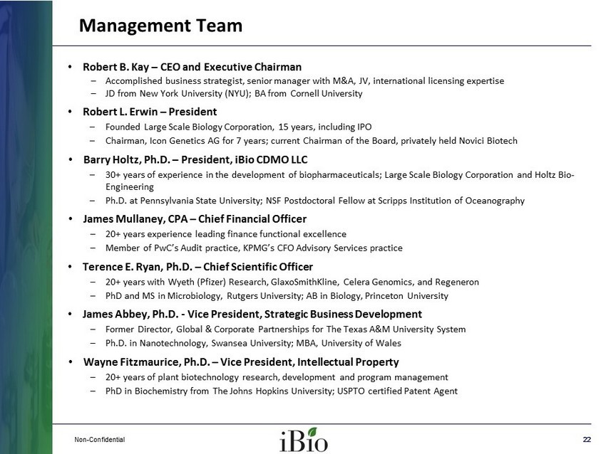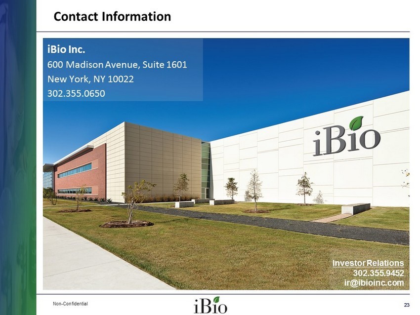 22 22 Management Team Non - Confidential 22 • Robert B. Kay – CEO and Executive Chairman – Accomplished business strategist, senior manager with M&A, JV, international licensing expertise – JD from New York University (NYU); BA from Cornell University • Robert L. Erwin – President – Founded Large Scale Biology Corporation, 15 years, including IPO – Chairman, Icon Genetics AG for 7 years; current Chairman of the Board, privately held Novici Biotech • Barry Holtz, Ph.D. – President, iBio CDMO LLC – 30+ years of experience in the development of biopharmaceuticals; Large Scale Biology Corporation and Holtz Bio - Engineering – Ph.D. at Pennsylvania State University; NSF Postdoctoral Fellow at Scripps Institution of Oceanography • James Mullaney, CPA – Chief Financial Officer – 20+ years experience leading finance functional excellence – Member of PwC’s Audit practice, KPMG’s CFO Advisory Services practice • Terence E. Ryan, Ph.D. – Chief Scientific Officer – 20+ years with Wyeth (Pfizer) Research, GlaxoSmithKline, Celera Genomics, and Regeneron – PhD and MS in Microbiology, Rutgers University; AB in Biology, Princeton University • James Abbey, Ph.D. - Vice President, Strategic Business Development – Former Director, Global & Corporate Partnerships for The Texas A&M University System – Ph.D. in Nanotechnology, Swansea University; MBA, University of Wales • Wayne Fitzmaurice, Ph.D. – Vice President, Intellectual Property – 20+ years of plant biotechnology research, development and program management – PhD in Biochemistry from The Johns Hopkins University; USPTO certified Patent Agent