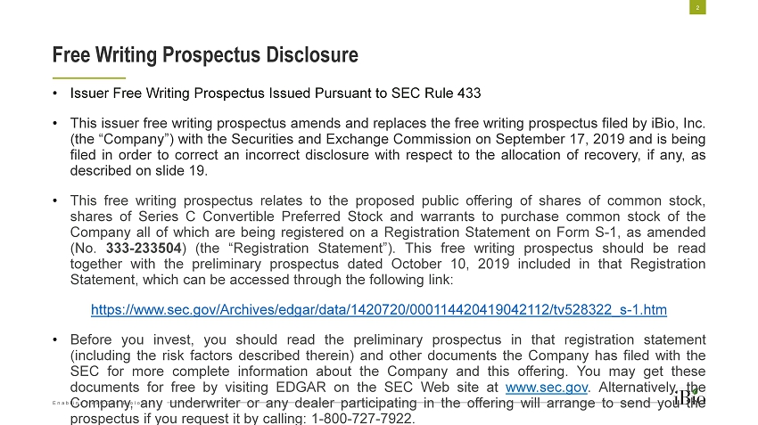Enabling Next - Gen Biologics • Issuer Free Writing Prospectus Issued Pursuant to SEC Rule 433 • This issuer free writing prospectus amends and replaces the free writing prospectus filed by iBio , Inc . (the “Company”) with the Securities and Exchange Commission on September 17 , 2019 and is being filed in order to correct an incorrect disclosure with respect to the allocation of recovery, if any, as described on slide 19 . • This free writing prospectus relates to the proposed public offering of shares of common stock, shares of Series C Convertible Preferred Stock and warrants to purchase common stock of the Company all of which are being registered on a Registration Statement on Form S - 1 , as amended (No . 333 - 233504 ) (the “Registration Statement”) . This free writing prospectus should be read together with the preliminary prospectus dated October 10 , 2019 included in that Registration Statement, which can be accessed through the following link : https://www.sec.gov/Archives/edgar/data/1420720/000114420419042112/tv528322_s - 1.htm • Before you invest, you should read the preliminary prospectus in that registration statement (including the risk factors described therein) and other documents the Company has filed with the SEC for more complete information about the Company and this offering . You may get these documents for free by visiting EDGAR on the SEC Web site at www . sec . gov . Alternatively, the Company, any underwriter or any dealer participating in the offering will arrange to send you the prospectus if you request it by calling : 1 - 800 - 727 - 7922 . Free Writing Prospectus Disclosure 2