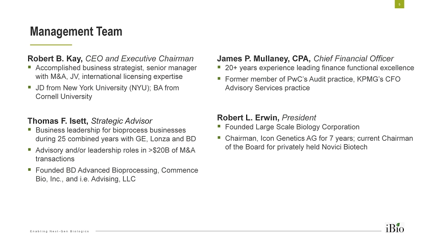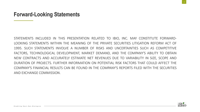 Enabling Next - Gen Biologics Forward - Looking Statements 3 STATEMENTS INCLUDED IN THIS PRESENTATION RELATED TO IBIO, INC . MAY CONSTITUTE FORWARD - LOOKING STATEMENTS WITHIN THE MEANING OF THE PRIVATE SECURITIES LITIGATION REFORM ACT OF 1995 . SUCH STATEMENTS INVOLVE A NUMBER OF RISKS AND UNCERTAINTIES SUCH AS COMPETITIVE FACTORS, TECHNOLOGICAL DEVELOPMENT, MARKET DEMAND, AND THE COMPANY'S ABILITY TO OBTAIN NEW CONTRACTS AND ACCURATELY ESTIMATE NET REVENUES DUE TO VARIABILITY IN SIZE, SCOPE AND DURATION OF PROJECTS . FURTHER INFORMATION ON POTENTIAL RISK FACTORS THAT COULD AFFECT THE COMPANY'S FINANCIAL RESULTS CAN BE FOUND IN THE COMPANY'S REPORTS FILED WITH THE SECURITIES AND EXCHANGE COMMISSION .
