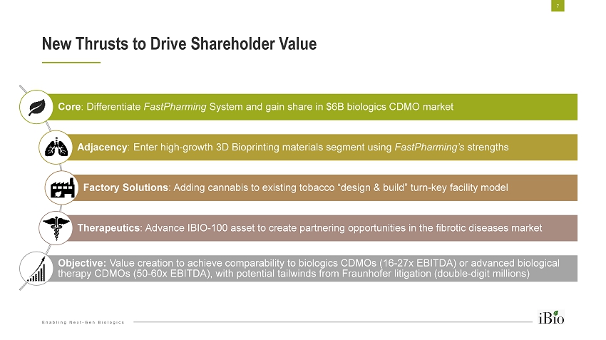 Enabling Next - Gen Biologics ▪ Refreshed strategy ▪ Enhanced brand & commercial capabilities ▪ New website & CRM ▪ Tradeshow and symposia plan ▪ Began hiring commercial team members ▪ Installed S&OP process to drive teamwork and financial rigor ▪ Re - evaluating proprietary product opportunities ▪ IBIO - 100 (formerly CFB - 03) ▪ Classical Swine Fever Vaccine ▪ Bioprocess consumables New Management Actions: FQ4’19 – FQ1’20 Highlights 6 New / Expanded, Announced Deals