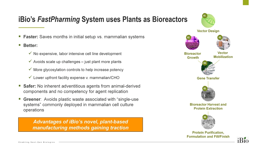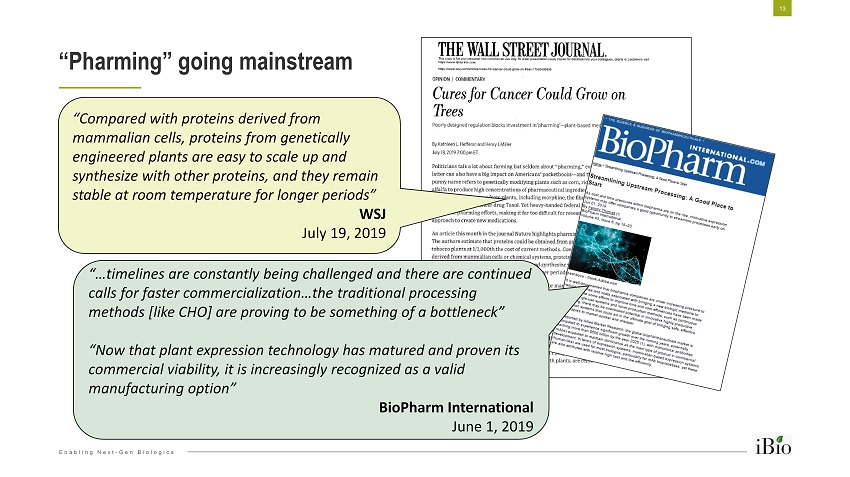 Enabling Next - Gen Biologics ▪ Faster: Saves months in initial setup vs. mammalian systems ▪ Better: x No expensive, labor intensive cell line development x Avoids scale up challenges – just plant more plants x More glycosylation controls to help increase potency x Lower upfront facility expense v. mammalian/CHO ▪ Safer: No inherent adventitious agents from animal - derived components and no competency for agent replication ▪ Greener : Avoids plastic waste associated with “single - use systems” commonly deployed in mammalian cell culture operations iBio’s FastPharming System uses Plants as Bioreactors 12 Vector Design Bioreactor Harvest and Protein Extraction Protein Purification, Formulation and Fill/Finish Bioreactor Growth Vector Mobilization Gene Transfer Advantages of iBio’s novel, plant - based manufacturing methods gaining traction