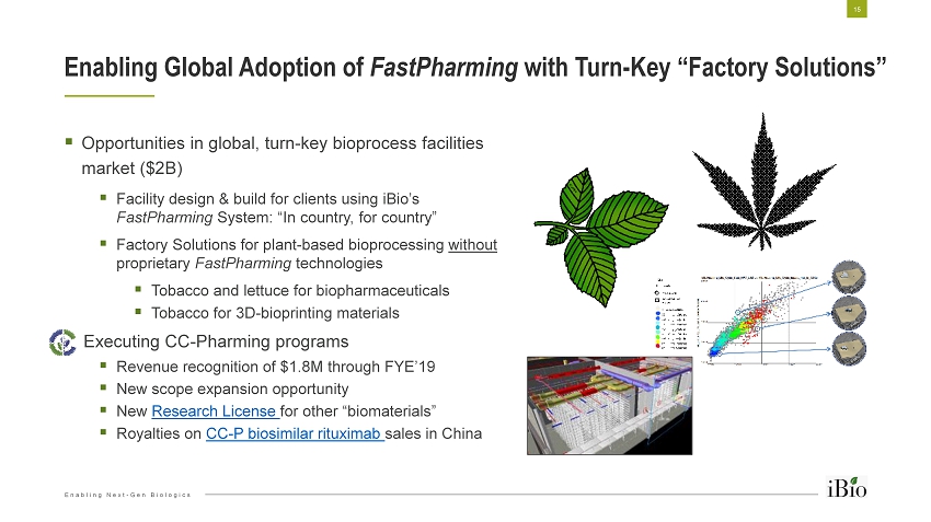 Enabling Next - Gen Biologics 0 20000 40000 60000 80000 100000 120000 140000 160000 180000 Supporting 3D - Bioprinting of Organs with the FastPharming System 14 ▪ iBio’s production of biologics in plants is uniquely suited for the manufacture of advanced bioinks for 3D Bioprinting o Safer: Mammalian viruses don’t grow in plants o Quicker: FastPharming shortens time - to - market for clients o Better: Easier to scale - up high - quality biofabrication materials ▪ Announced multi - year bioink development and supply agreement with United Therapeutics in August 2019 From organdonor.gov Demand gap + new biofabrication techs creating market for 3D bioprinted tissues and organs… >$2B industry >$1B supplies by 2025 Donors Transplants Waiting List U.S. Organ Shortage Courtesy of United Therapeutics