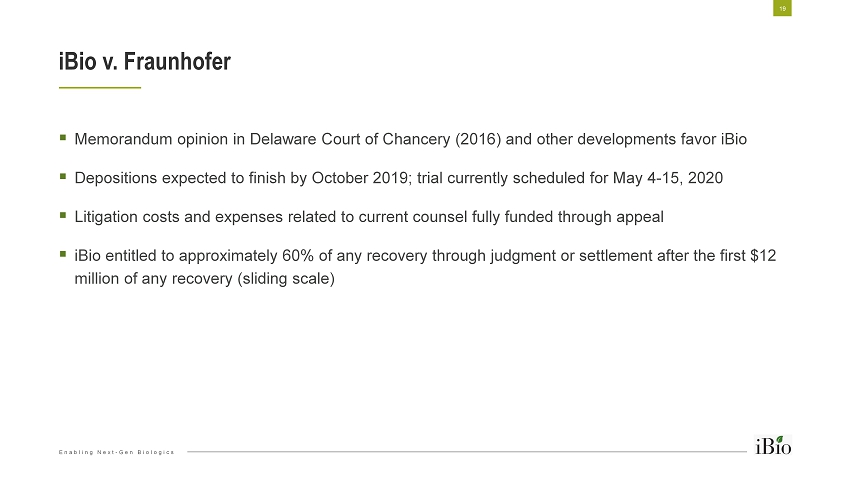 Enabling Next - Gen Biologics ▪ Memorandum opinion in Delaware Court of Chancery (2016) and other developments favor iBio ▪ Depositions expected to finish by October 2019; trial currently scheduled for May 4 - 15, 2020 ▪ Litigation costs and expenses related to current counsel fully funded through appeal ▪ iBio entitled to approximately 60% of any recovery through judgment or settlement after the first $12 million of any recovery (sliding scale) iBio v. Fraunhofer 19