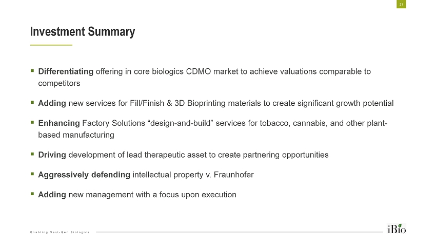 Enabling Next - Gen Biologics ▪ Process Development ▪ cGMP Manufacturing ▪ Fill / Finish ▪ Bioanalytics ▪ Quality & Regulatory ▪ Factory Solutions Value Proposition 20 ▪ Speeds time - to - market vs. traditional approaches ▪ Powerful glycan engineering tools can increase potency, quality of clients’ products ▪ Easy, consistent scale - up ▪ Addresses unmet medical needs for fibrotic diseases ▪ U.S. Orphan Drug Designation for systemic scleroderma ▪ Next milestones: Toxicology and cGMP manufacturing ▪ Contract manufacturing of “animal free” bioinks used in 3D bioprinting of tissues and organs ▪ Plants provide other advantages over competing expression technologies CDMO Services FastPharming ™ IBIO - 100 Anti - Fibrotic Regen Med/3D - Bioprinting Biologics CDMO Market: $6B ▪ Added Fill/Finish ▪ Developing bioanalytics capability ▪ Launching Factory Solutions IP Well Protected ▪ 80 issued patents in various countries (26 U.S.) ▪ 39 active patent applications ▪ Aggressively defending Fibrosis Market: >$2B ▪ ~125K patients in U.S. alone ▪ ~60% forego treatment Bioprinting: ~$1B by 2025 ▪ United Therapeutics: catalyst for iBio’s supply of biomaterials to this new, high - growth segment ▪ Launching marketing efforts in bioprinting sub - segment Recent, Select Biologics CDMO Deals “Advanced Therapy” CDMO Transactions: Thermo Fisher / Brammer Bio ($1.7B) ; Catalent / Paragon ($1.2B) Traditional Biologics CDMO Deals: Thermo Fisher / Patheon ($7.2B) ; Catalent / Cook ($950M)