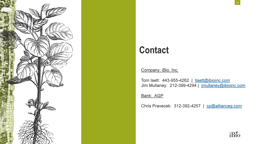 Contact 23 Company: iBio , Inc. Tom Isett: 443 - 955 - 4262 | tisett@ibioinc.com Jim Mullaney: 212 - 399 - 4294 | jmullaney@ibioinc.com Bank: AGP Chris Pravecek: 312 - 392 - 4257 | cp@allianceg.com