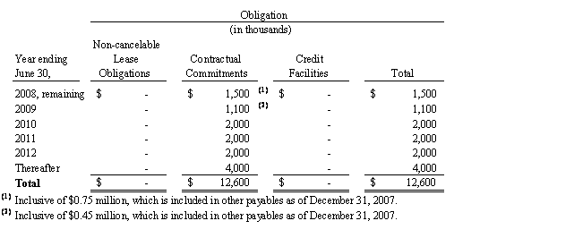 As of December 31 and June 30, 2007, the Company has made payments of approximately $2.5 million and $1.9 million as of June 30, 2006 for the purchase commitment of $3.6 million, of which $1.15 million is accrued, $750,000 is to be paid in fiscal year 2008, with the remaining $400,000 to be paid in the fiscal year 2009.