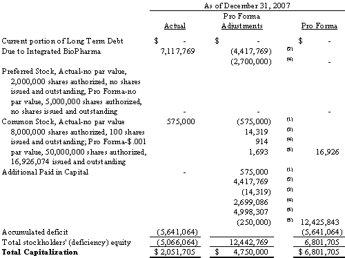 As disclosed in Note 9. Equity Transactions, in November 2007, the Company entered into a Separation and Distribution Agreement (the Distribution) with its Parent, whereby, the Parent has agreed to distribute, pro rata, to the holders of its common stock, all of the shares of the Companys common stock owned by Integrated BioPharma, Inc.. The completion of the Distribution is subject to various customary closing conditions, including the declaration by the U.S. Securities and Exchange Commission of the effectiveness of the registration under the Securities Exchange Act of 1934 of the Companys common stock. The Distribution should qualify as a tax-free reorganization under Section 355 of the Internal Revenue Code of 1986, as amended. The Agreement prohibits the Company from issuing any additional shares of its common stock in excess of the shares issued with respect to the Distribution for the two years immediately following the effective date of the Distribution.