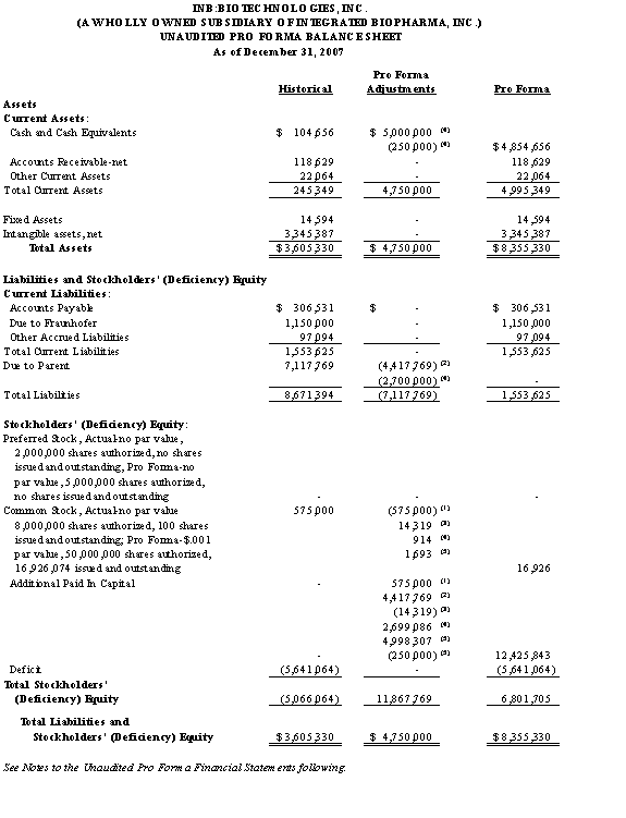 This information statement is being furnished in connection with the distribution of 100% of the issued and outstanding shares of InB:Biotechnologies, Inc. (InB:Biotechnologies) common stock by Integrated BioPharma, Inc. (Integrated BioPharma) to its holders of common stock. References in this Information Statement to we, us or our Company refer to InB:Biotechnologies. Immediately following the distribution, we will complete a private offering of shares of our common stock to a limited number of investors for gross proceeds of approximately $5.0 million and will also issue additional shares of our common stock to Integrated BioPharma in lieu of intercompany debt. As a result of these subsequent transactions, we expect that the current stockholders of Integrated BioPharma will own 84.6% of the issued and outstanding shares of InB:Biotechnologies common stock, the investors in the private offering will own an aggregate of 10% of such shares, and Integrated BioPharma will own 5.4% of such shares.