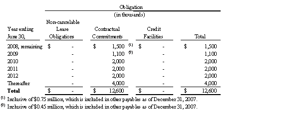 Recent Accounting Pronouncements. In July 2006, the FASB issued FASB Interpretation No. 48, Accounting for Uncertainty in Income Taxes-an interpretation of FASB Statement No. 109 (FIN 48), which clarifies the accounting for uncertainty in income tax positions. FIN 48 requires that we recognize in our financial statements, the impact of a tax position that is more likely than not to be sustained upon examination based on the technical merits of the position. This interpretation was effective as of July 1, 2007. The adoption of FIN 48, did not have a material impact on the Companys consolidated financial position, results of operations and cash flows for the six months ended December 31, 2007.