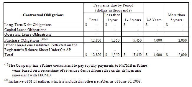 As of June 30, 2008 and 2007, the Company has made payments of approximately $2.6 million and $2.5 million, respectively for the purchase commitment of $3.6 million, of which $1.05 million is accrued and is to be paid in fiscal year 2009.