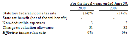 Deferred income taxes reflect the tax effects of temporary differences between the carrying amounts of assets and liabilities for financial accounting purposes and the amounts used for income tax reporting. Significant components of the Company’s deferred tax assets as of June 30, 2008 and 2007 follow: