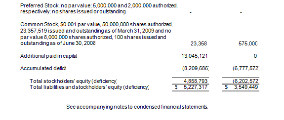 Condensed Balance Sheets as of March 31, 2009 (unaudited) and June 30, 2008 |
