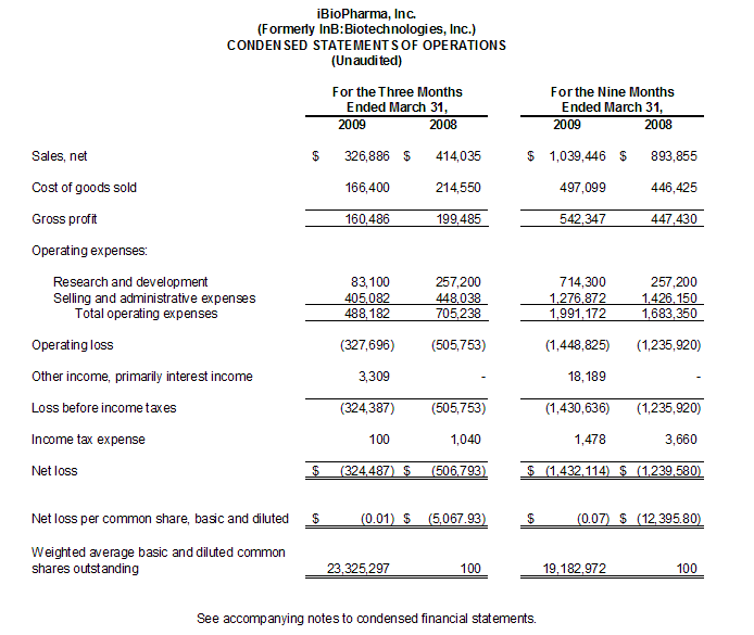 Condensed Statements of Operations for The Three and Nine Months Ended March 31, 2009 and 2008 (unaudited) |