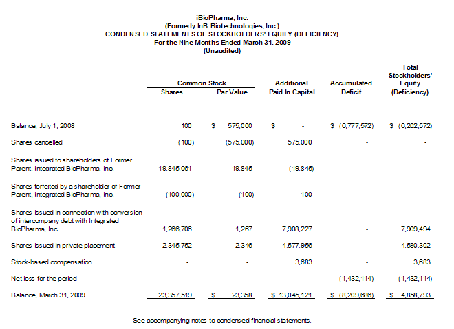 Condensed Statements of Changes in Stockholders’ Equity (Deficiency) for The Nine Months Ended March 31, 2009 (unaudited) |