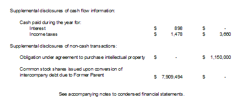 The increase in cash provided from financing activities of approximately $3,470,000 in the nine months ended March 31, 2009 compared to the nine months ended March 31 2008 is a result of the net proceeds of $4,580,000 from our completion of the $5.0 million private placement of capital completed in August 2008 offset by a net decrease in advances from our Former Parent of $1,110,000.