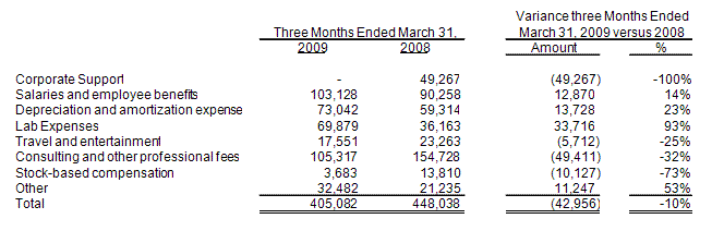 Consulting and other professional fees decreased by approximately $49,400 or 32% in the three months ended March 31, 2009 to approximately $105,300 compared to approximately $154,700 in the three months ended March 31, 2008. Consulting and other professional fees consist of legal, outside accounting services, director’s fees, scientific advisory board (“SAB”) expenses (both travel and consulting fees) and consulting fees paid to outside consultants and our own Chief Scientific Officer. The decrease of $49,400 in consulting and other professional fees, , from the three months ended March 31, 2009 compared to March 31, 2008 was primarily the result of decreases in accounting fees of $12,900, legal fees of $52,000 and directors' fees of $4,700 offset by increases in transitional fees of $25,000.